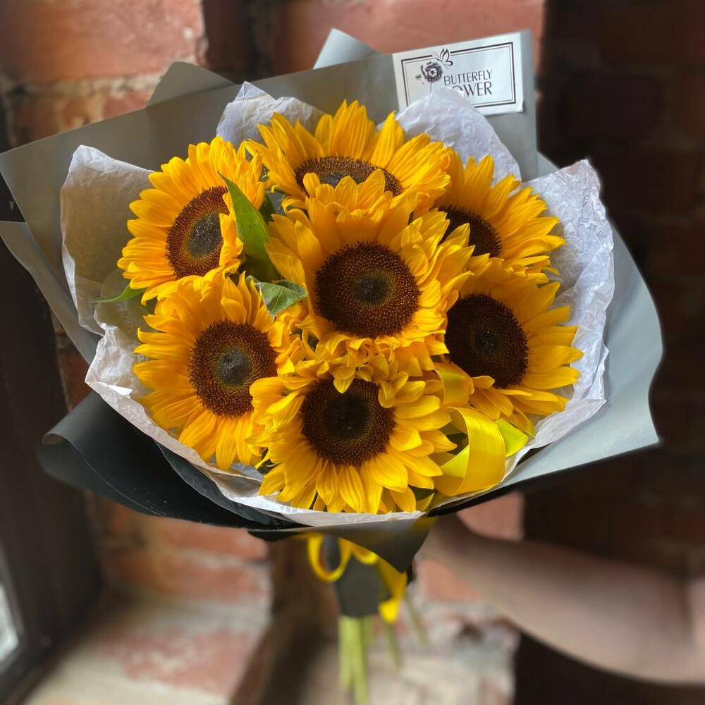 Букет из 7 подсолнухов в стильной упаковке “Сфера”