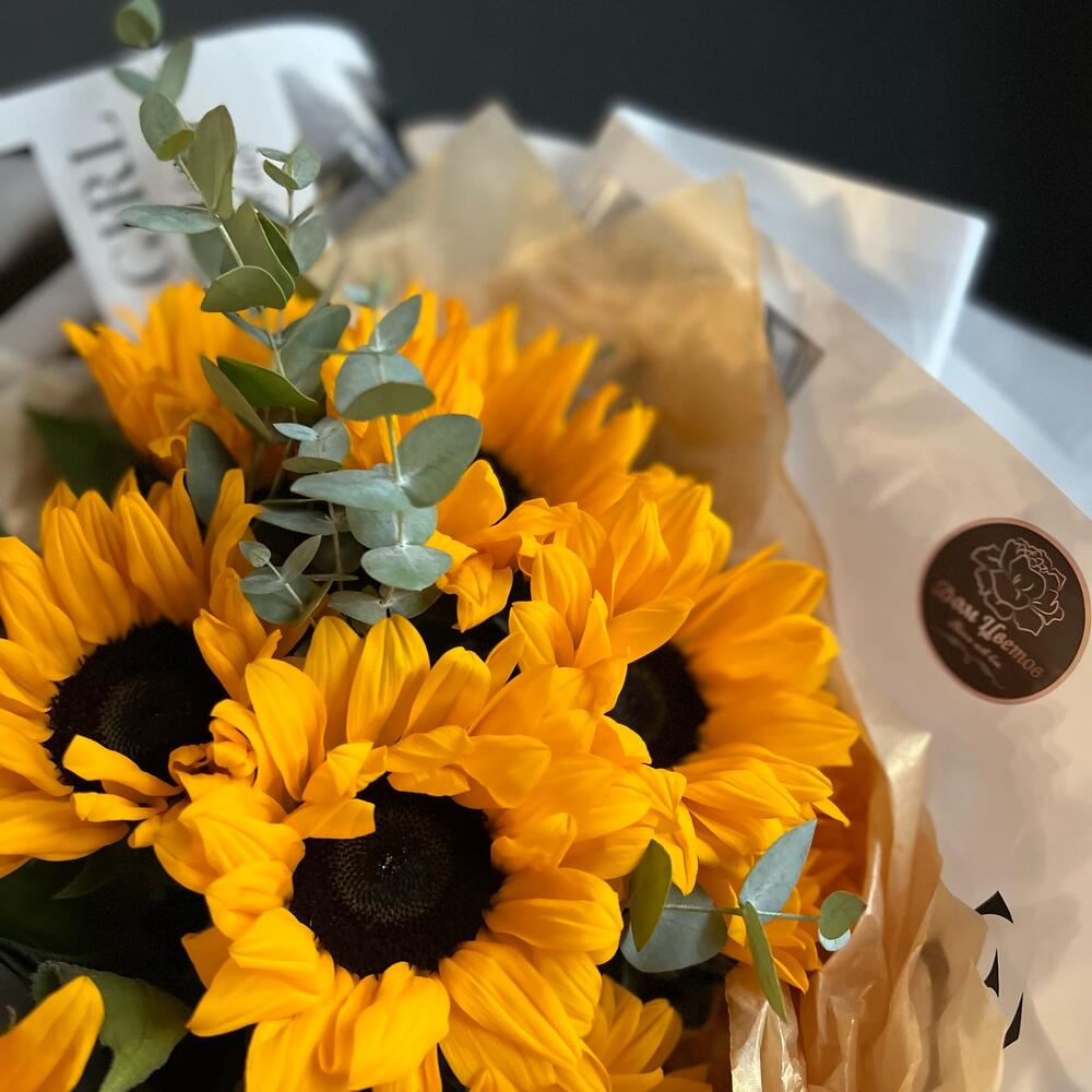 Подсолнух – 11 шт.Эвкалипт – 5 шт.декоративная упаковка – 1 шт.Атласная лента – 1 шт.