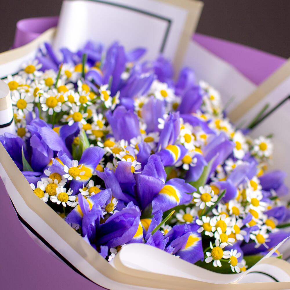 Ирис – 15 шт.Ромашка – 10 шт.Лента атласная – 1 шт.Упаковка матовая – 1 шт.