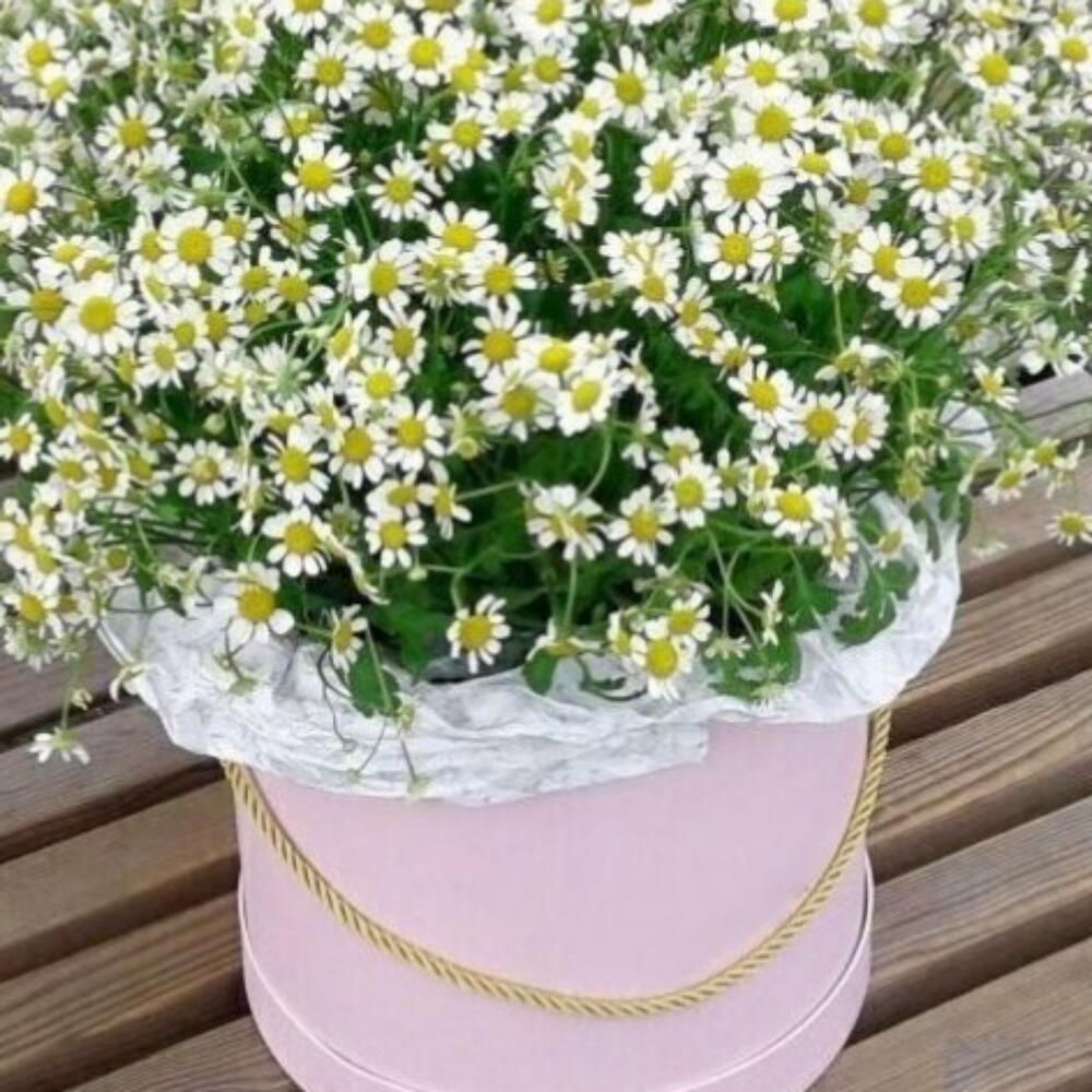 Ромашки в розовой шляпной коробке