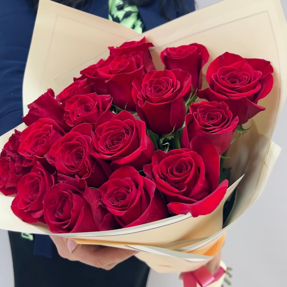роза эквадор 60 см премиум – 21 шт.Лента атласная красная – 1 шт.Пленка дизайнерская – 2 шт.Роза Эквадор 60 см – 21 шт.