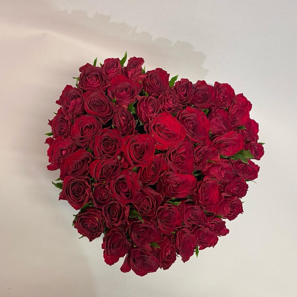 Роза красная – 51 шт.Коробка-сердце – 1 шт.Оазис флористический – 2 шт.