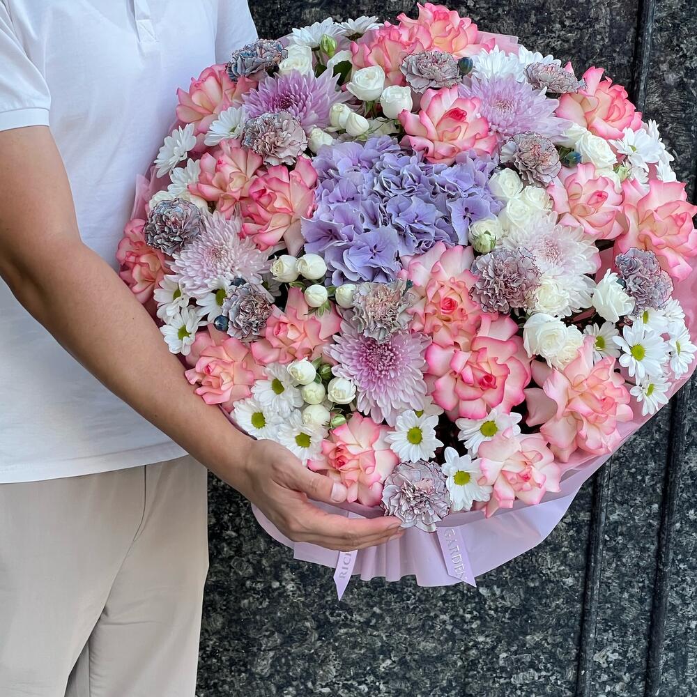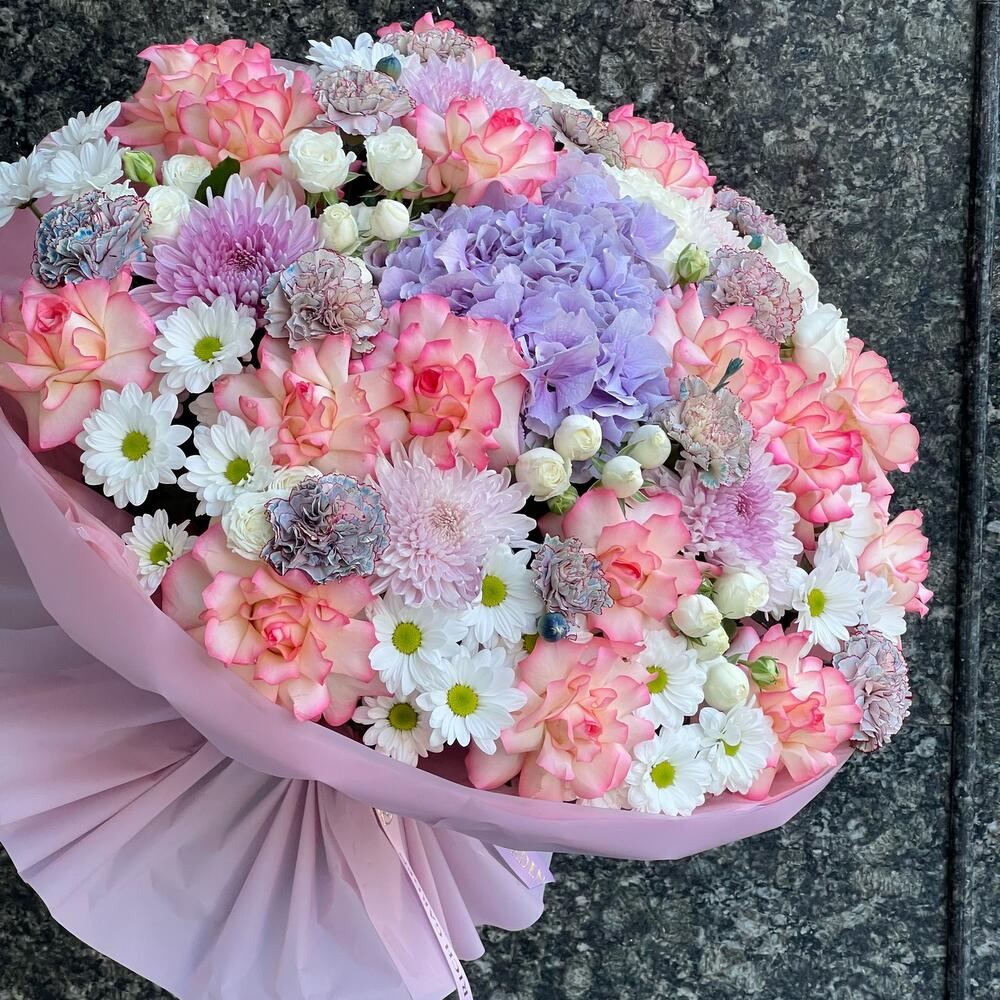 Гортензия – 1 шт. Роза – 17 шт. Спрей роза – 3 шт. Хризантема – 5 шт. Хризантема кустовая – 8 шт. Рускус – 5 шт. Диантус – 12 шт. бумага дизайнерская – 1 шт.