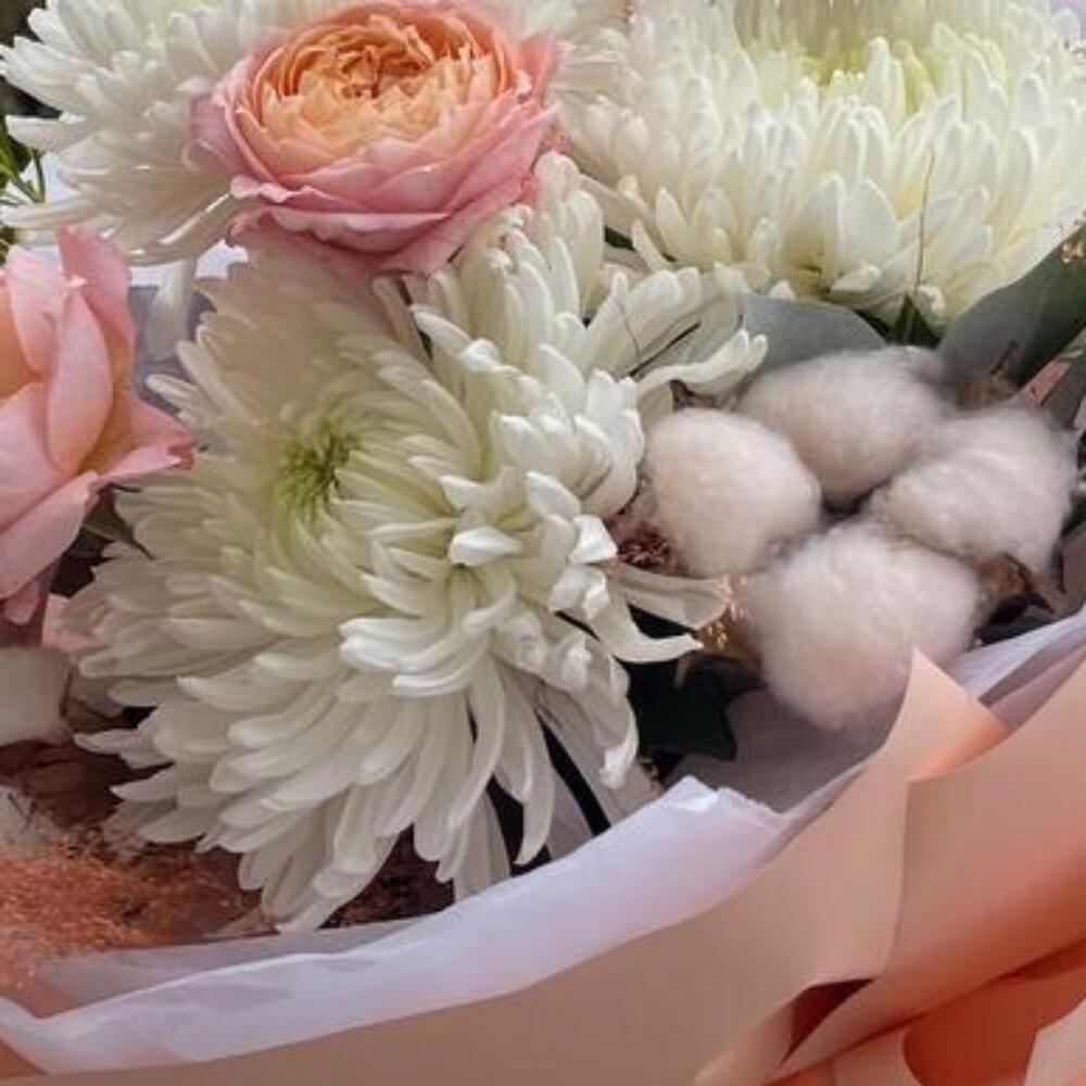 Авторский букет с хризантемой и пионовидной розой