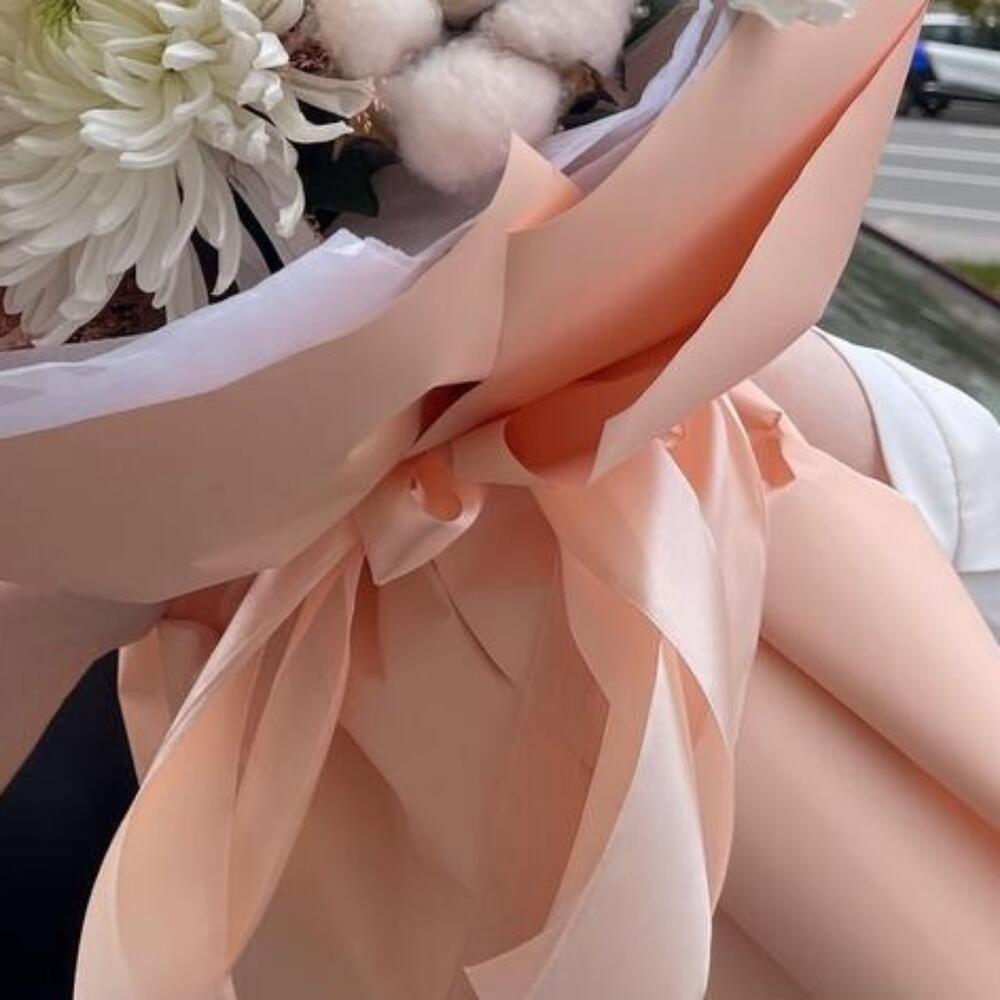 Лента – 2 шт.Салал – 4 шт.Хризантема – 3 шт.Гвоздика – 2 шт.Тишью – 2 шт.Роза пионовидная – 1 шт.Хамелациум – 1 шт.Сухоцвет – 2 шт.Пленка матовая – 2 шт.