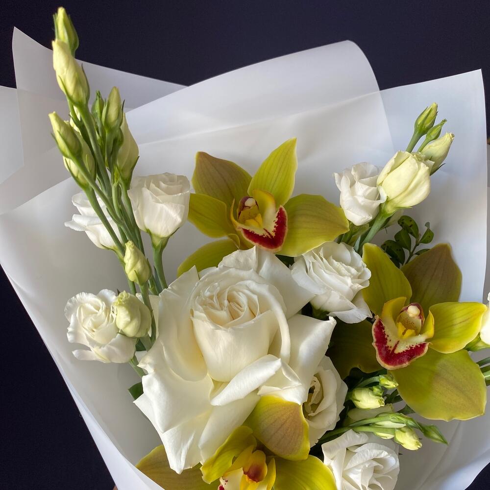 Орхидея Цимбидиум – 3 шт.Роза французская – 1 шт.Зелень – 1 шт.Лизиантус – 5 шт.Матовая пленка – 4 шт.Лента атласная – 1 шт.