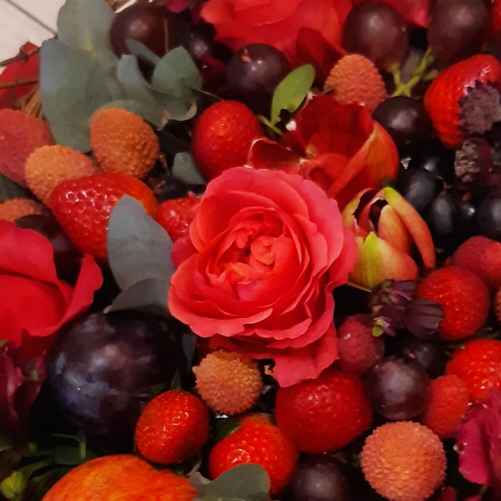 Клубника – 15 шт.Роза красная – 7 шт.Лента атласная – 1 шт.Гранат – 1 шт.Слива – 5 шт.Виноградная лоза – 9 шт.Виноград гроздь – 5 шт.зелень декоративная – 10 шт.виноград черный – 2 шт.экзотика – 7 шт.микс цветов – 11 шт.упаковка дизайнерская1 – 1 шт.