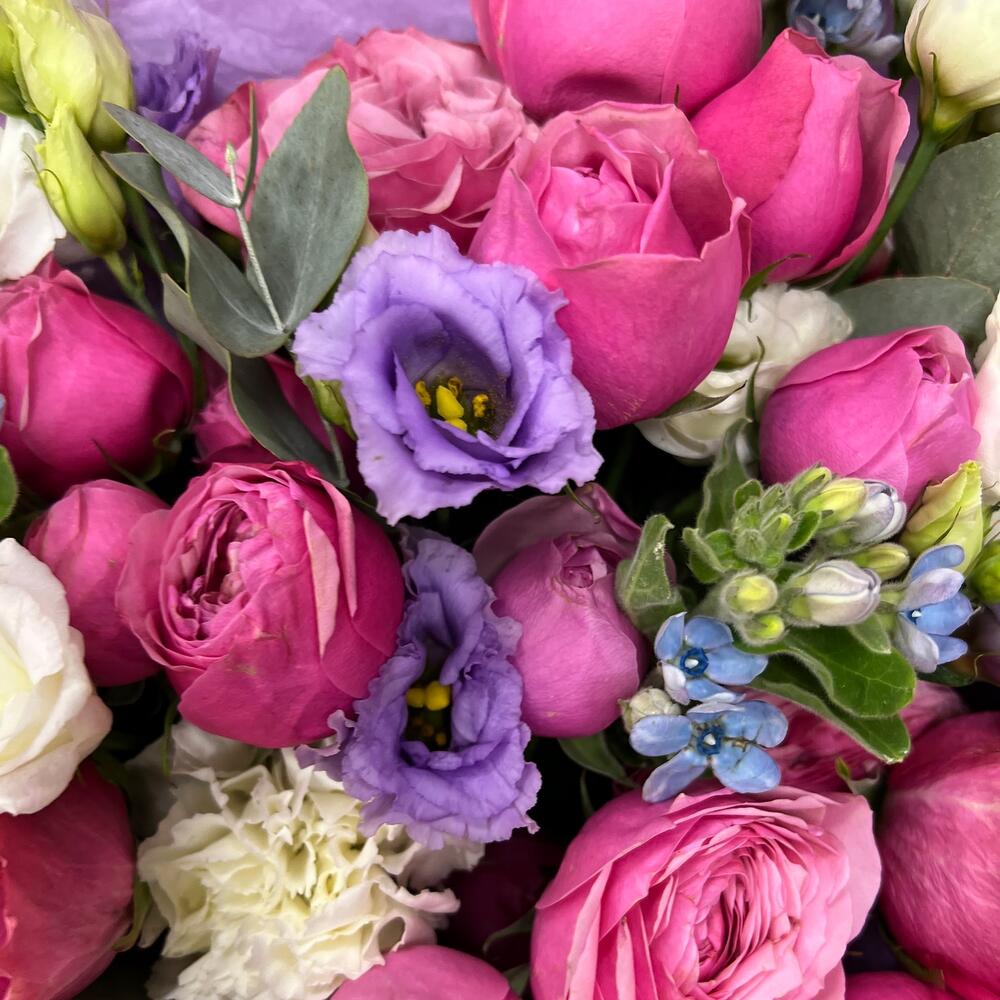 Эвкалипт – 3 шт.Лента атласная – 2 шт.Оксипеталум – 3 шт.Диантус одноголовый – 3 шт.Пленка матовая – 3 шт.эустома розита вайт – 1 шт.роза country blues 50 см – 3 шт.роза кустовая сильва пинк – 4 шт.эустома махровая лавандовая – 2 шт.