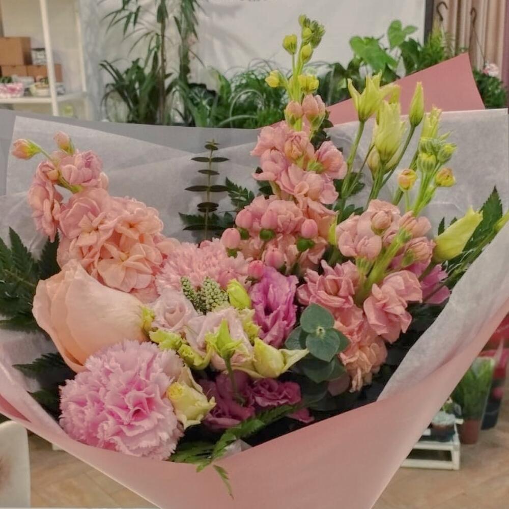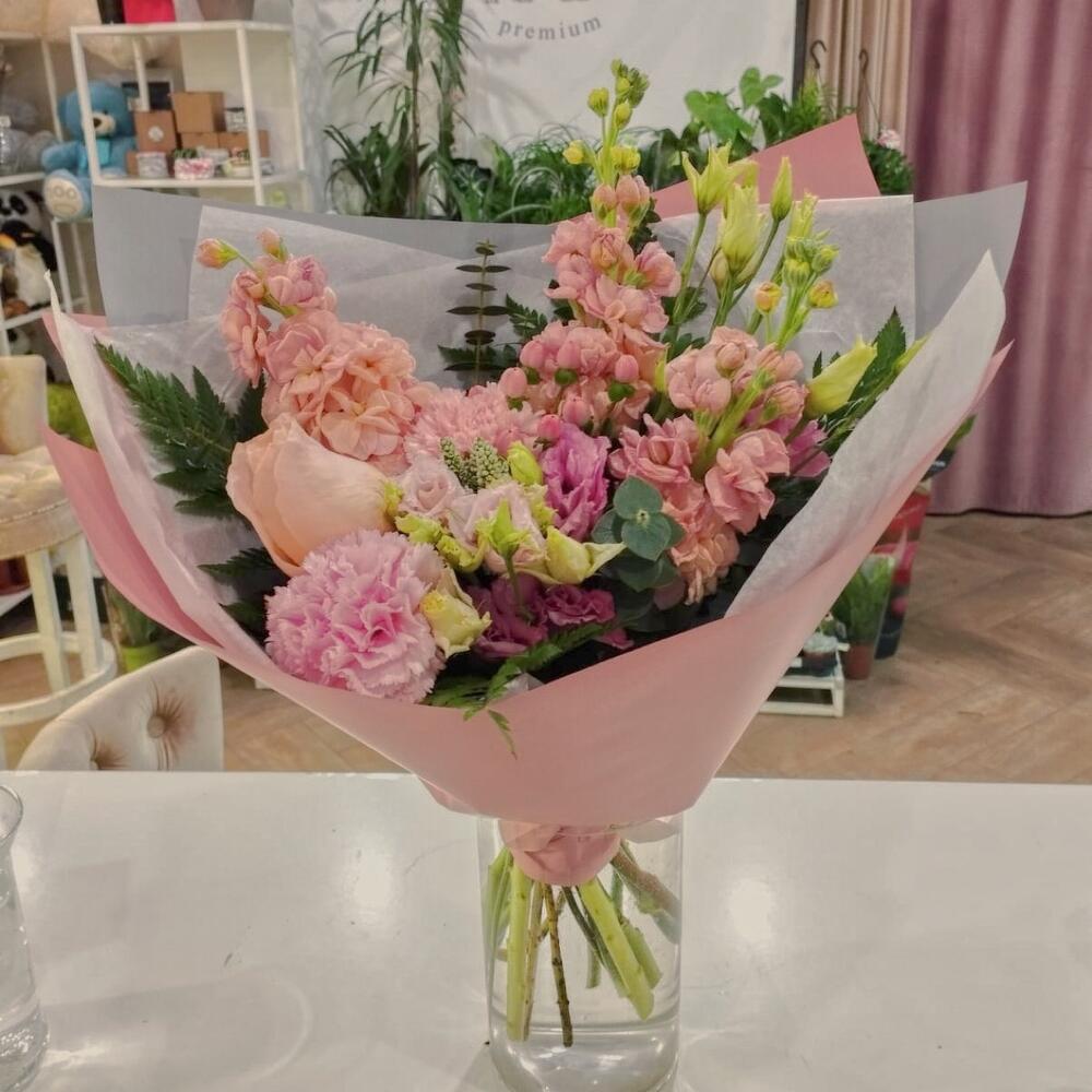 Маттиола – 3 шт.Гвоздика – 2 шт.Роза – 1 шт.Хиперикум – 1 шт.Лизиантус – 2 шт.Папоротник – 1 шт.