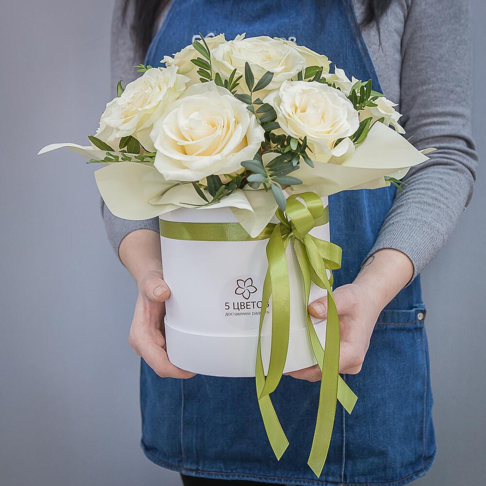 Роза белая – 9 шт.Коробка шляпная – 1 шт.