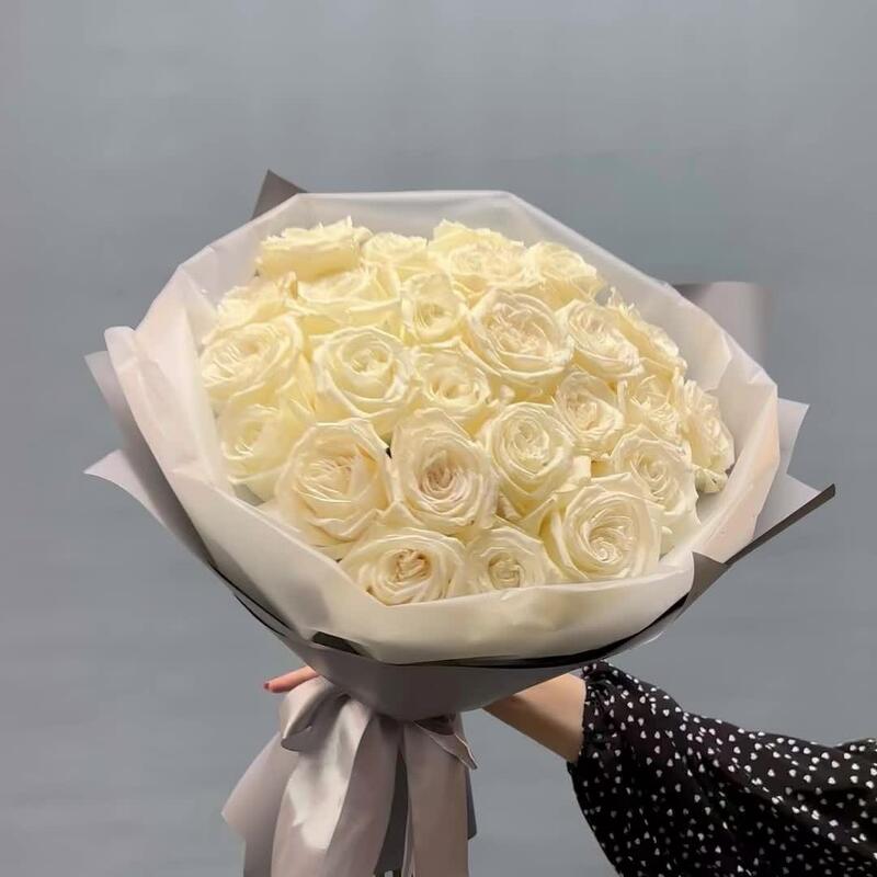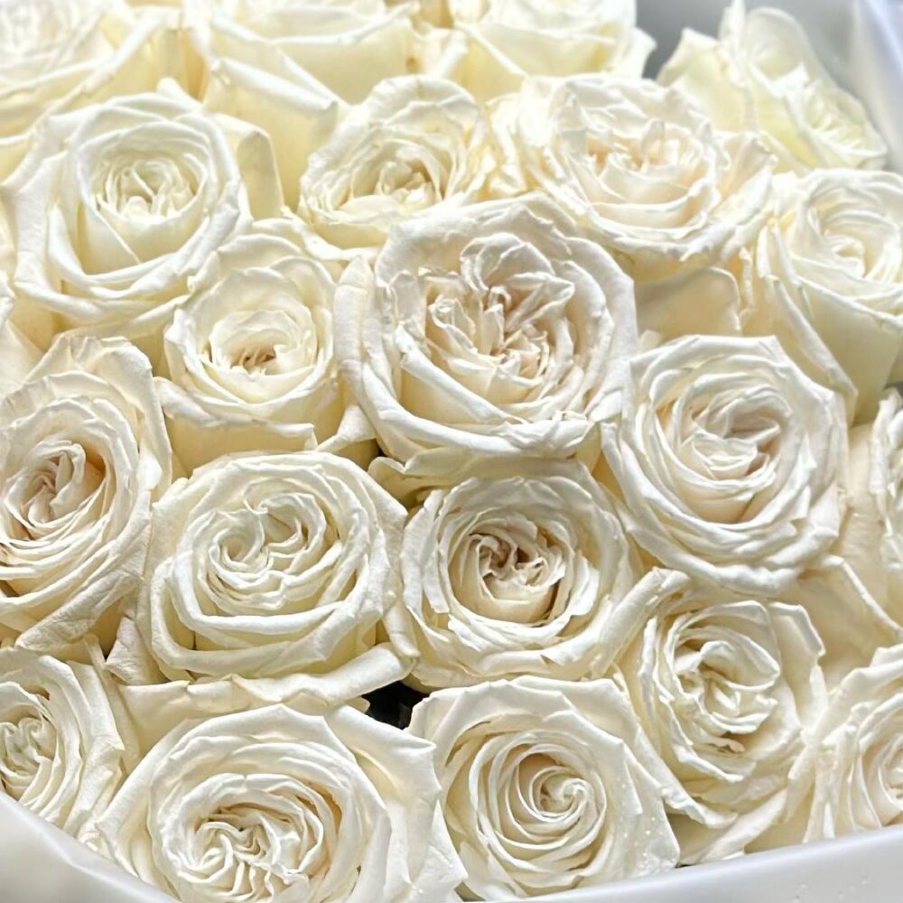 роза пионовидная плая бланка – 25 шт.Тишью белое – 1 шт.Дизайнерская упаковка – 1 шт.Лента атласная – 2 шт.