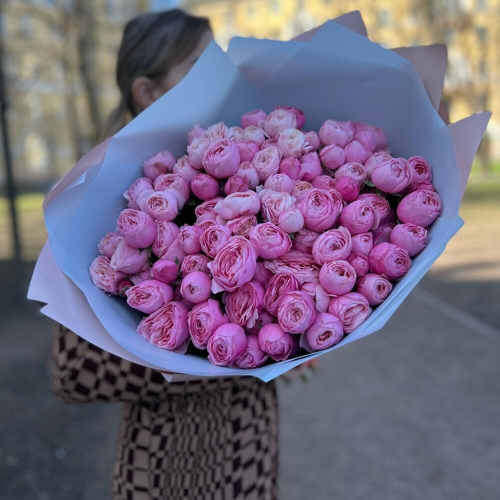 Лента атласная – 1 шт.Упаковка дизайнерская – 4 шт.Пионовидная кустовая роза – 25 шт.