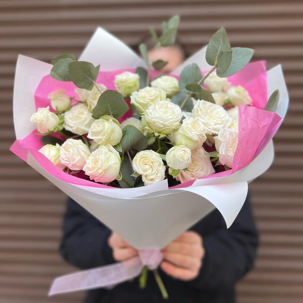 Кустовая роза Бомбастик – 5 шт.Эвкалипт – 4 шт.Тишью – 1 шт.Пленка матовая – 2 шт.Лента атласная – 1 шт.