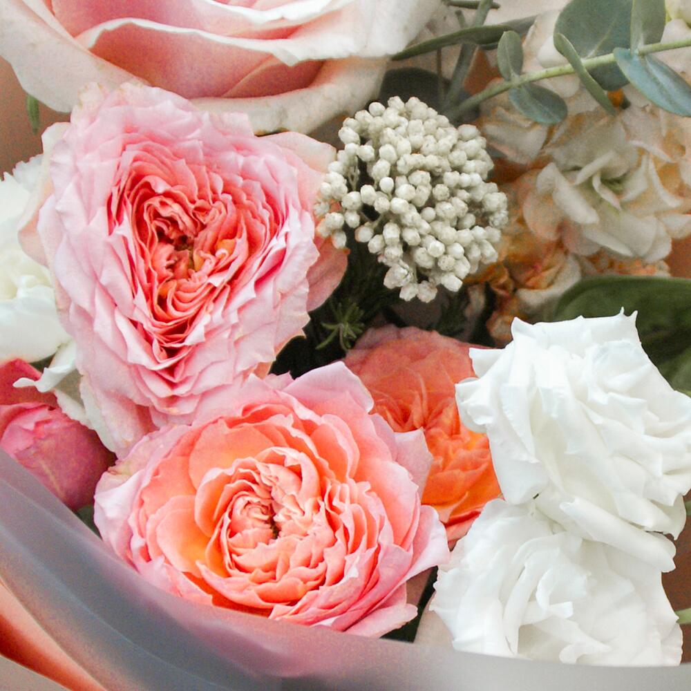 Французская роза – 1 шт.Роза кустовая пионовидная джульетта – 1 шт.Эустома – 1 шт.Маттиола – 1 шт.Диантус – 2 шт.Озотамнус – 1 шт.Эвкалипт – 1 шт.Пленка – 2 шт.Атласная лента – 2 шт.