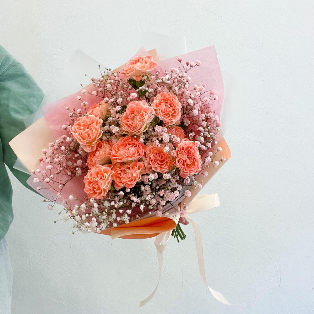 Гипсофила – 4 шт.Лента атласная – 1 шт.Тишью – 1 шт.Роза кустовая пионовидная – 3 шт.Корейская пленка – 3 шт.