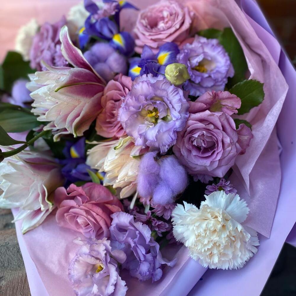 Букет из лилии, хлопка, эустомы, роз, диантусов, ирисов, кустовой хризантемы и самшита в стильной упаковке “Джун Осборн”