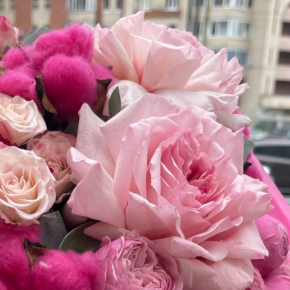 Салал – 5 шт.Роза – 3 шт.Кустовая роза – 7 шт.Лента атласная – 2 шт.Тишью – 4 шт.Пионовидная роза – 2 шт.Пленка матовая – 1 шт.Хлопок натуральный – 3 шт.