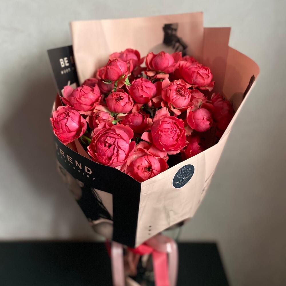Кустовая пионовидная роза – 5 шт.декоративная упаковка – 2 шт.Атласная лента – 1 шт.