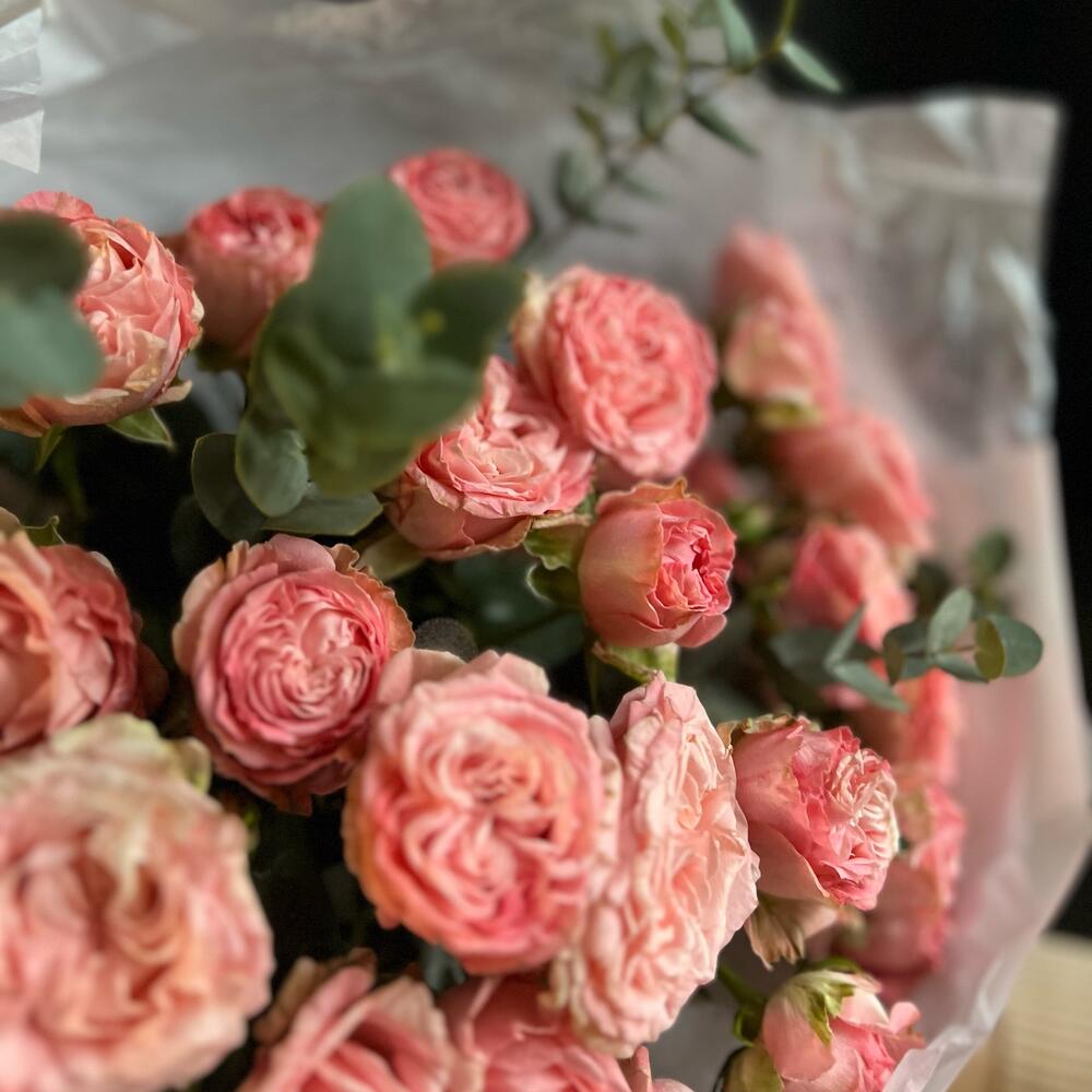 Кустовая пионовидная роза – 7 шт.Эвкалипт – 9 шт.декоративная упаковка – 1 шт.Атласная лента – 1 шт.