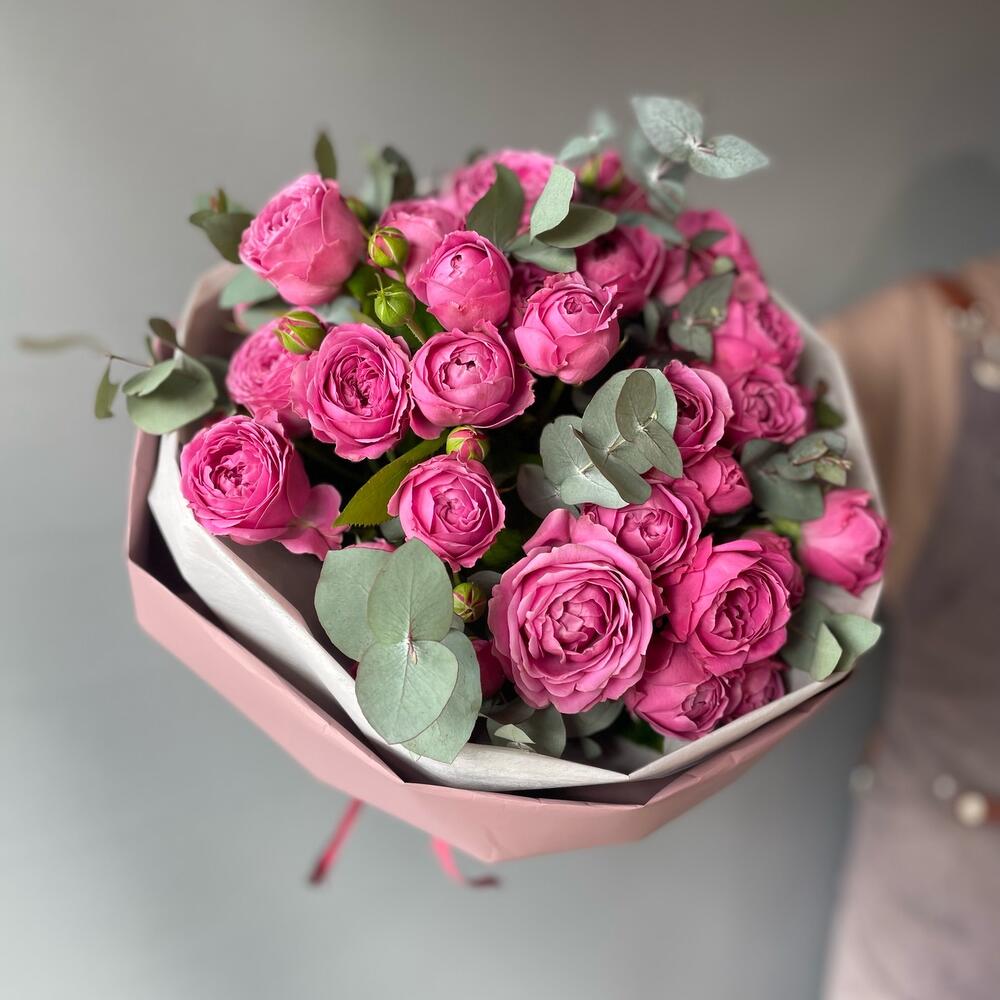 Эвкалипт – 5 шт.Роза пионовидная кустовая – 9 шт.Упаковка дизайнерская – 2 шт.