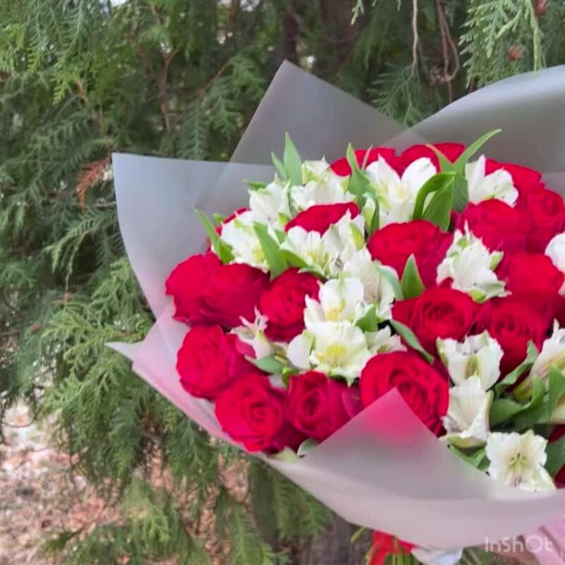 Роза красная – 25 шт.Альстромерия – 7 шт.Пленка матовая – 2 шт.