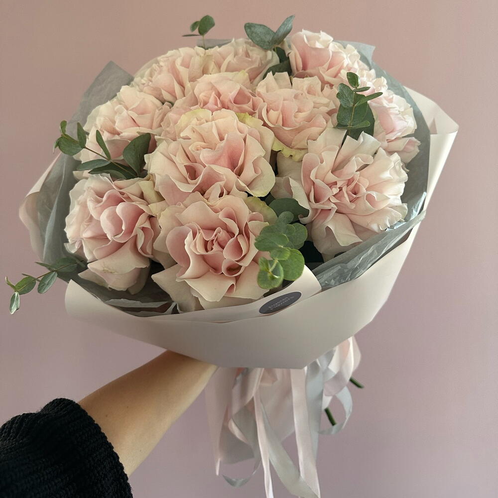 Пышный и ароматный букет из французских роз с эвкалиптом.