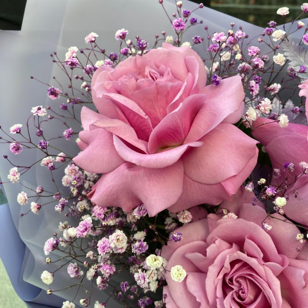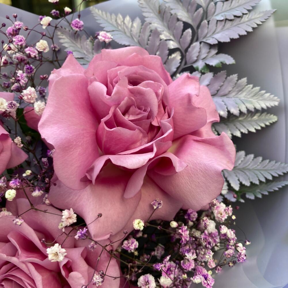 Гипсофила – 3 шт.Лента – 2 шт.Папоротник – 1 шт.Роза – 3 шт.Упаковка дизайнерская – 2 шт.