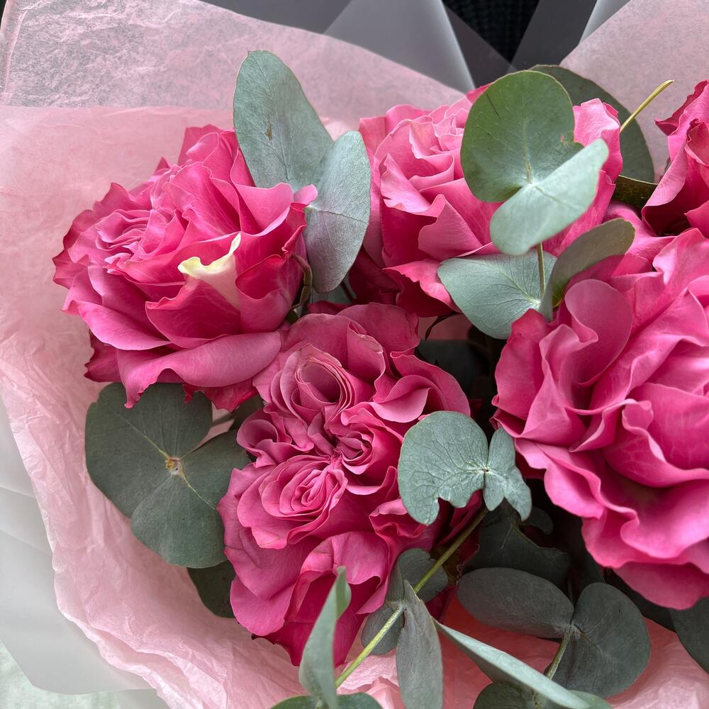 Роза пионовидная – 5 шт.Эвкалипт – 1 шт.Лента – 2 шт.Упаковка дизайнерская – 2 шт.