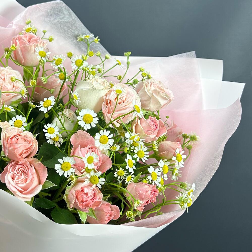 Букет кустовых розовых роз с матрикарией