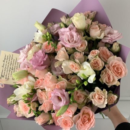 Роза Мондиаль – 25 шт.Лизиантус – 10 шт.Роза кустовая – 10 шт.Эвкалипт – 15 шт.Рускус – 20 шт.Пленка корейская – 4 шт.Лента атласная – 2 шт.Роза шиммер – 24 шт.