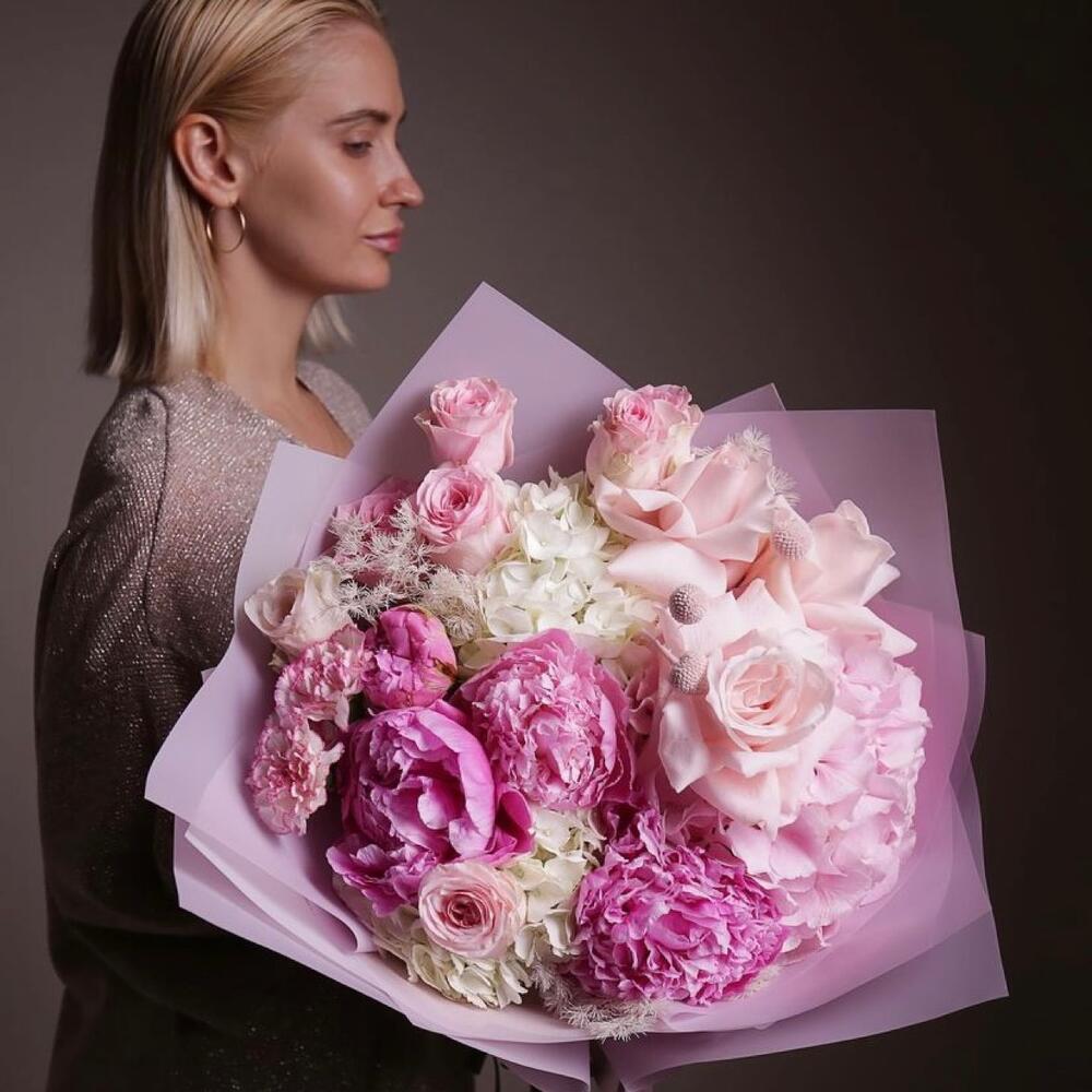 роза ассорти – 9 шт.Гортензия – 4 шт.Пион – 5 шт.Гвоздика – 5 шт.Упаковка дизайнерская – 1 шт.Лента атласная – 2 шт.Открыточка с вашими пожеланиями – 1 шт.хорошее настроение – 100 шт.инструкция по уходу за цветами – 1 шт.коробка переноска – 1 шт.Кризал – 1 шт.