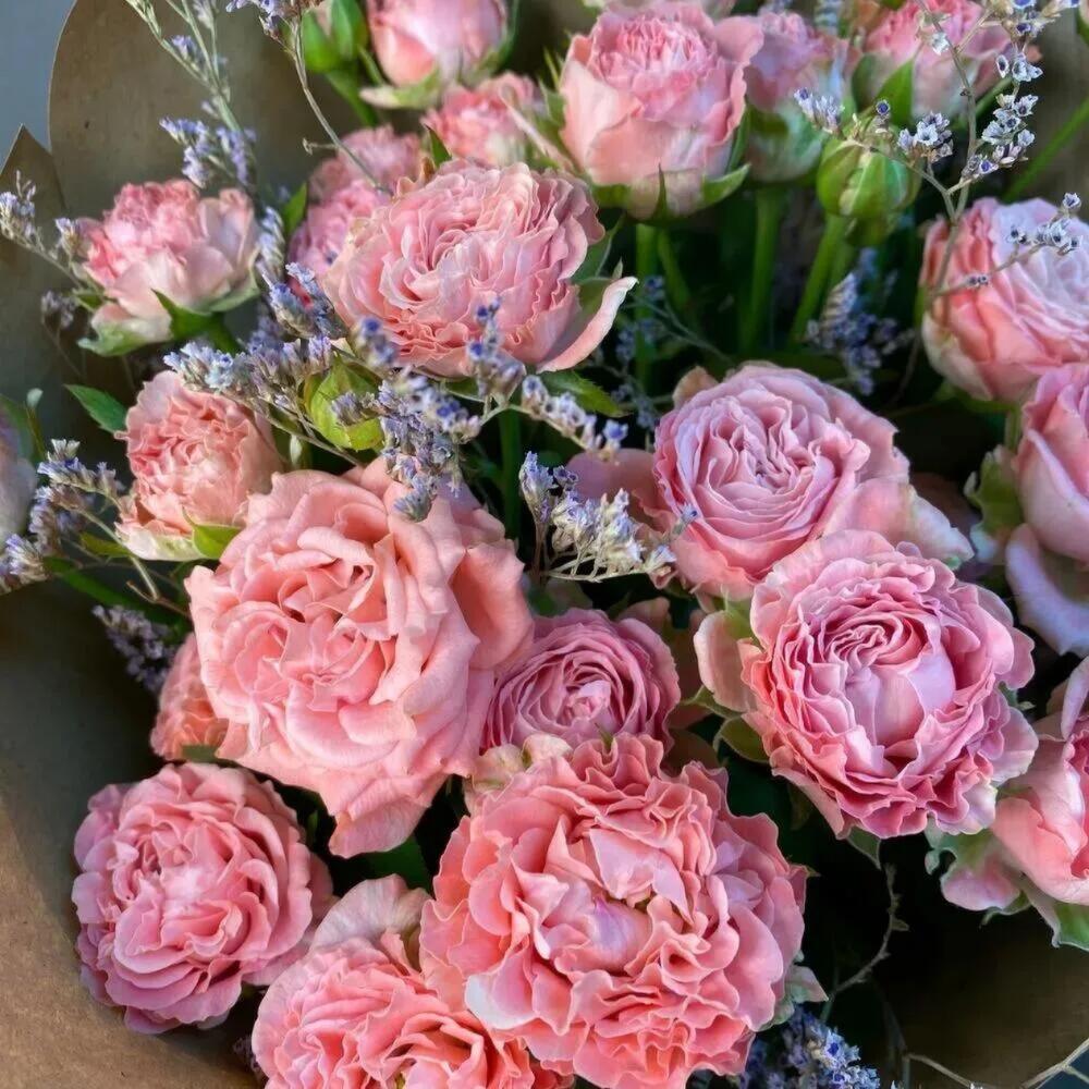 роза кустовая кучерявая – 5 шт.Лимониум – 3 шт.Упаковка крафт – 1 шт.Джут – 1 шт.