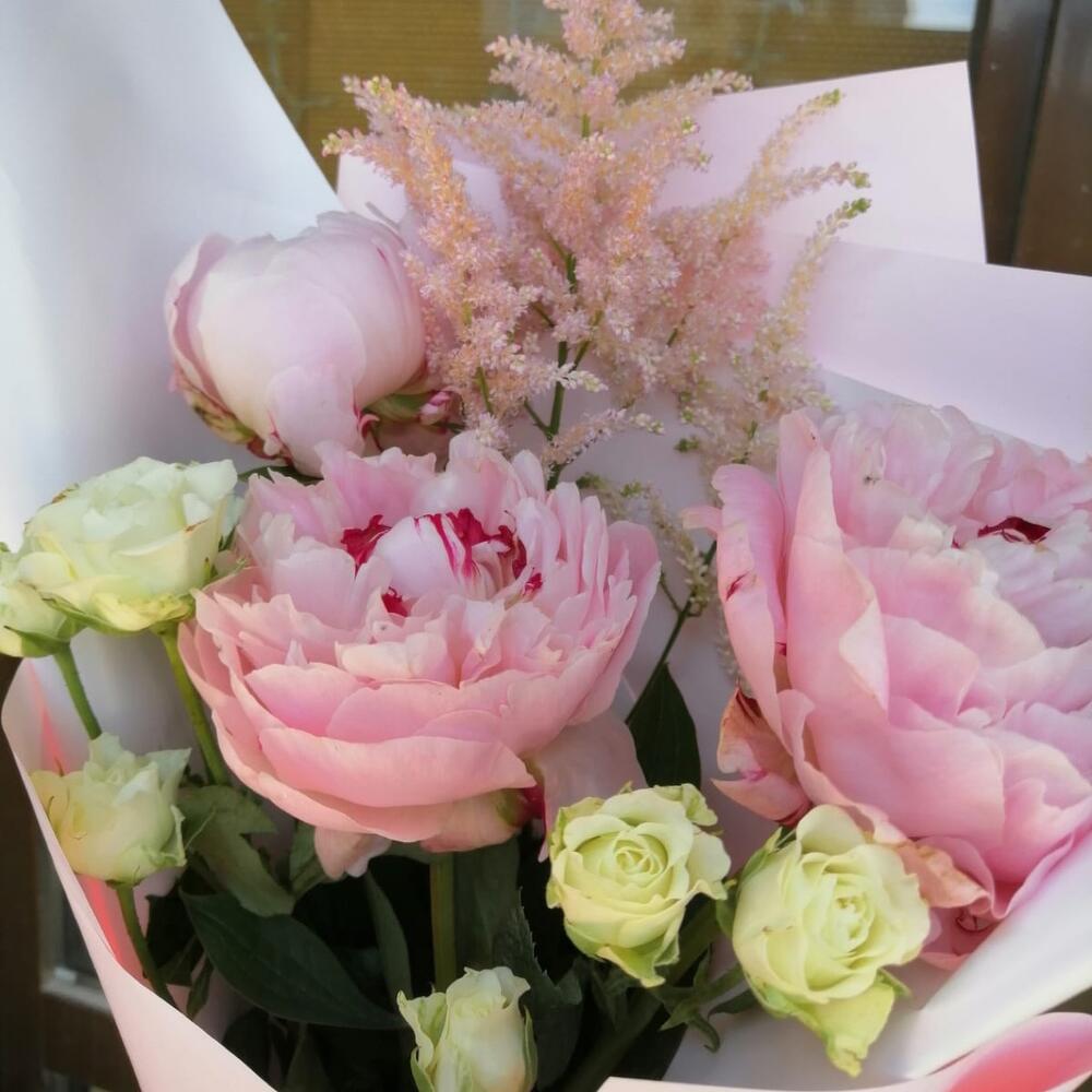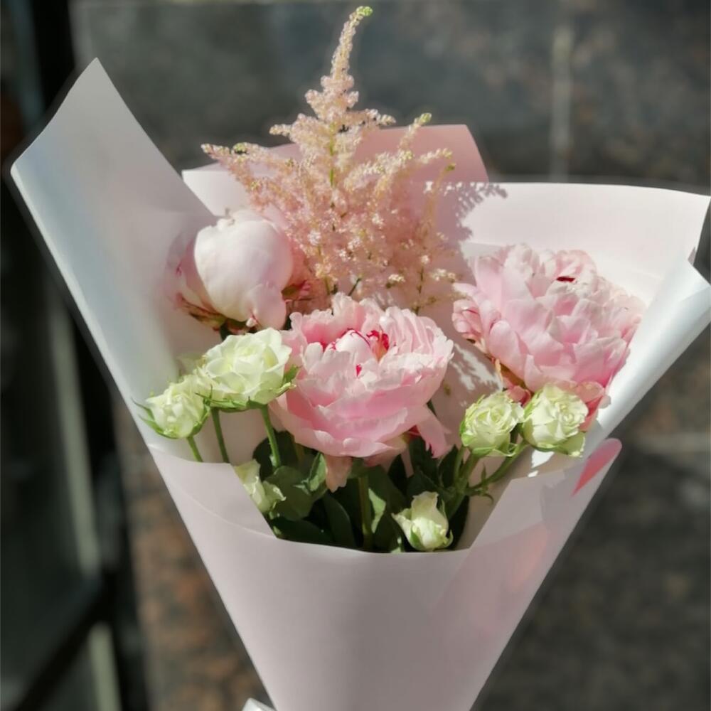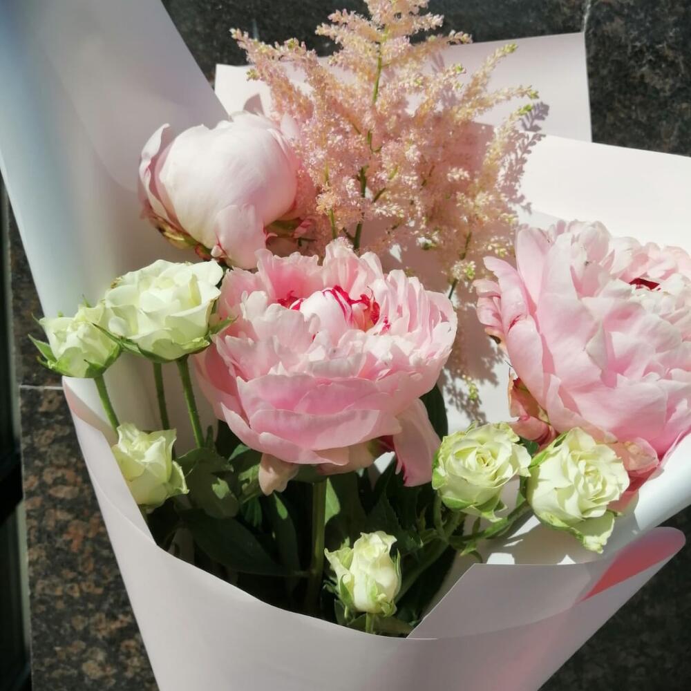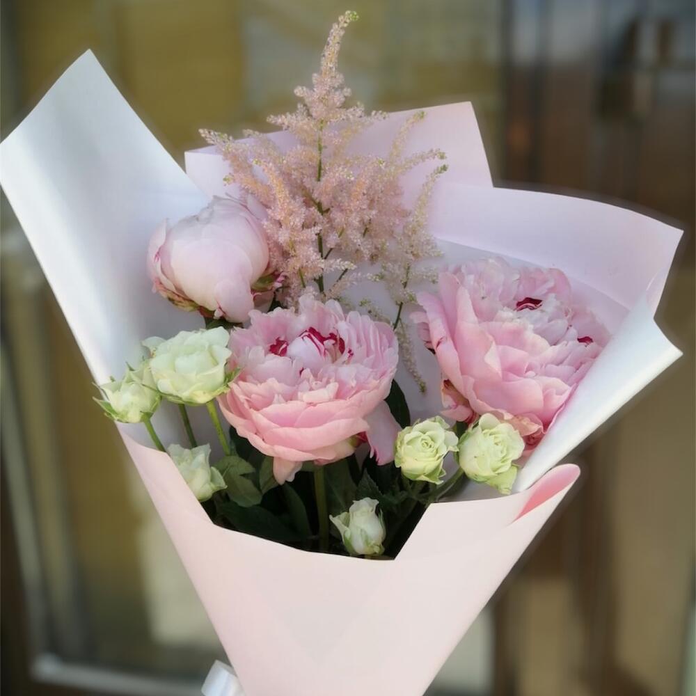 Астильба – 1 шт.Пион – 3 шт.Кустовая роза – 2 шт.Упаковка дизайнерская – 1 шт.
