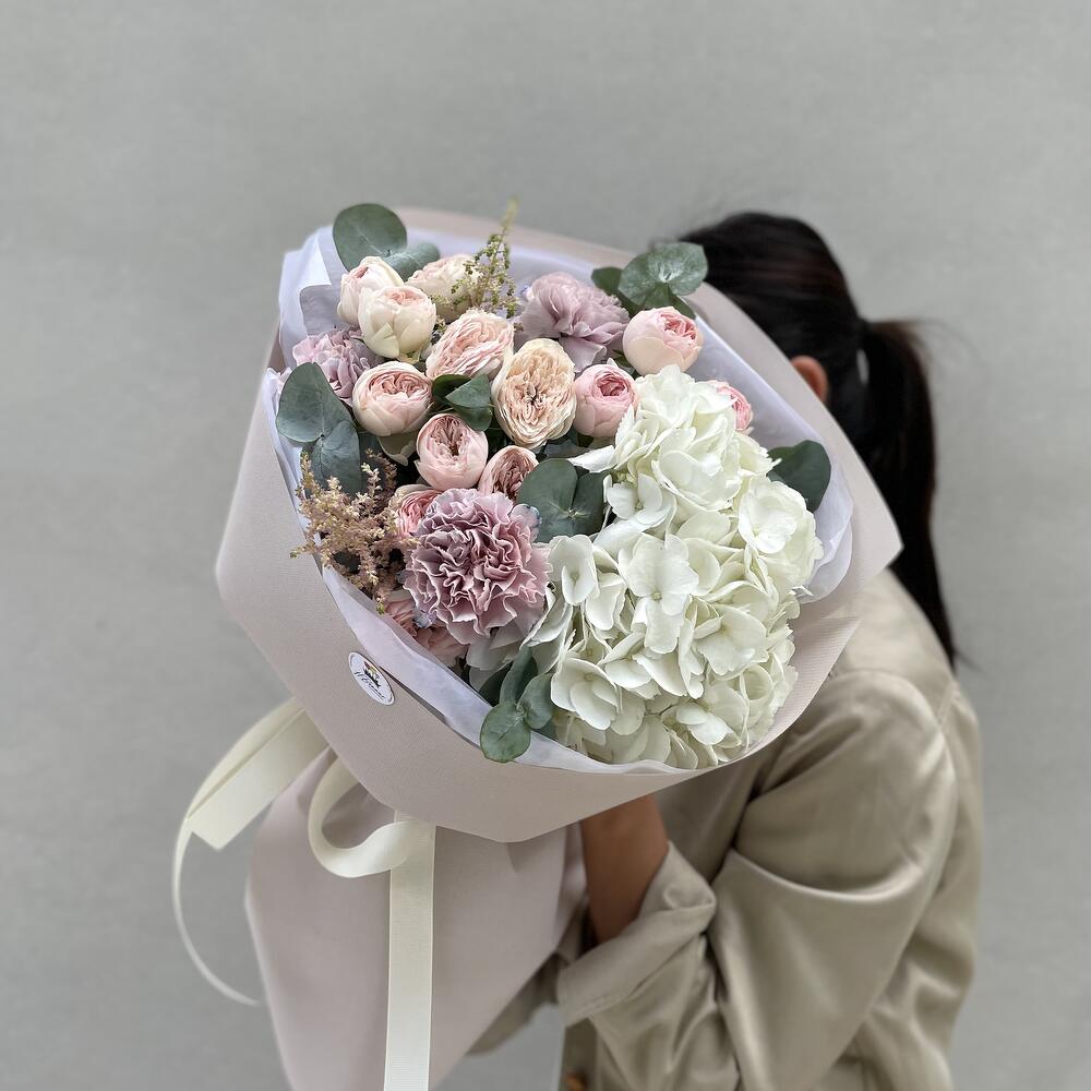 Гортензия – 1 шт. пионовидные спрей роза – 5 шт. гвоздика эксклюзивная – 3 шт. Астильба – 2 шт. Эвкалипт – 2 шт.