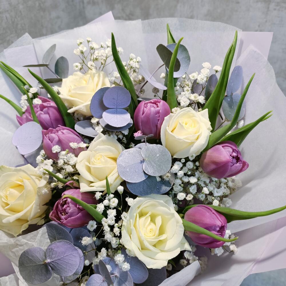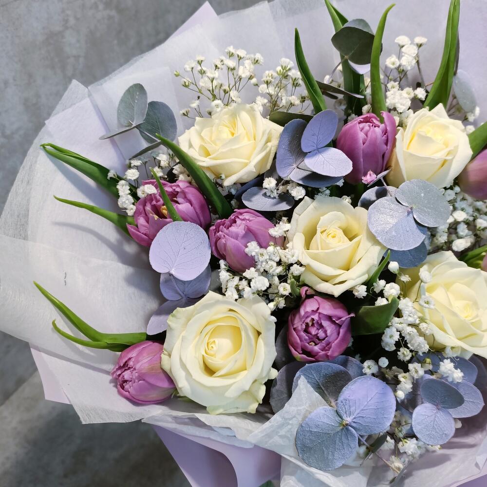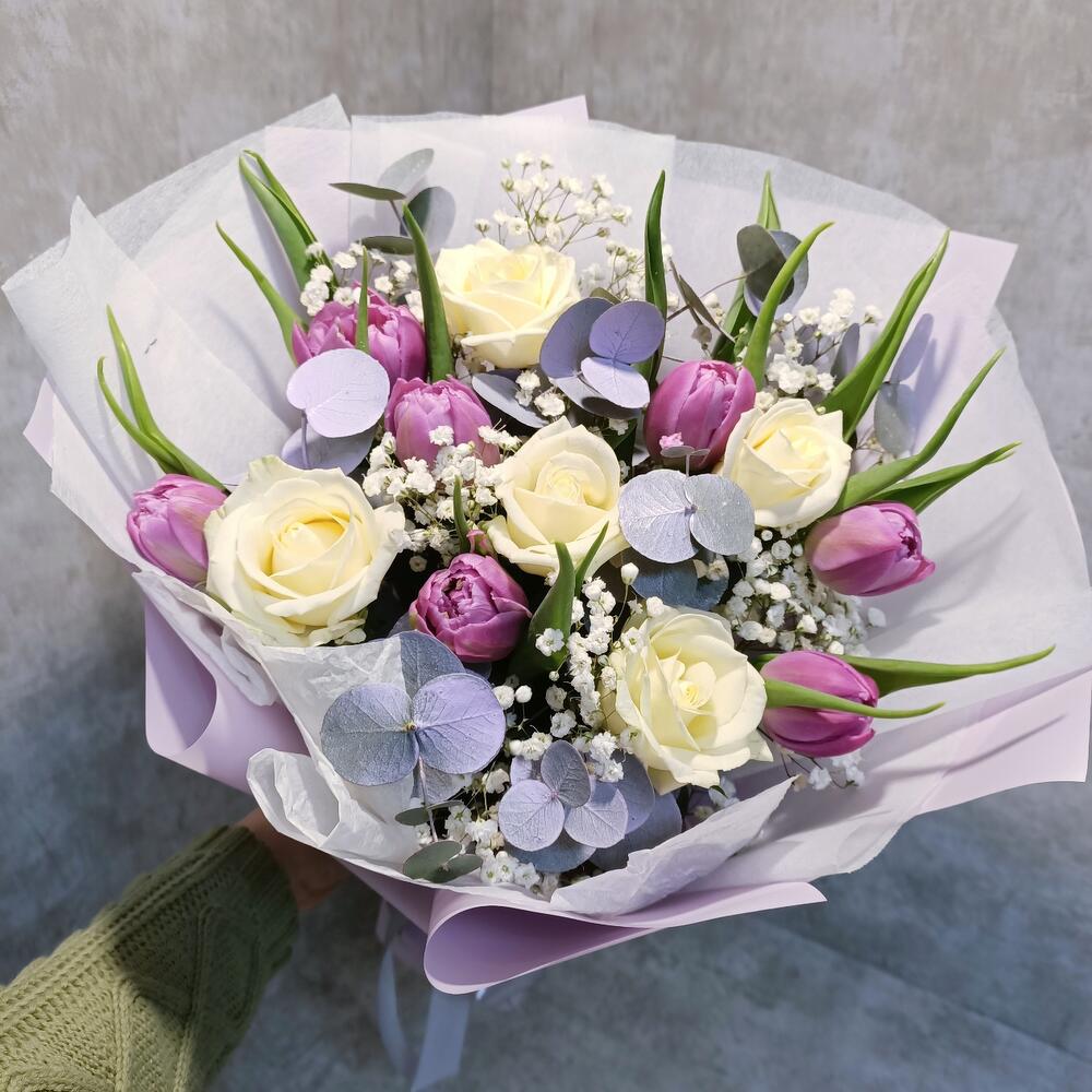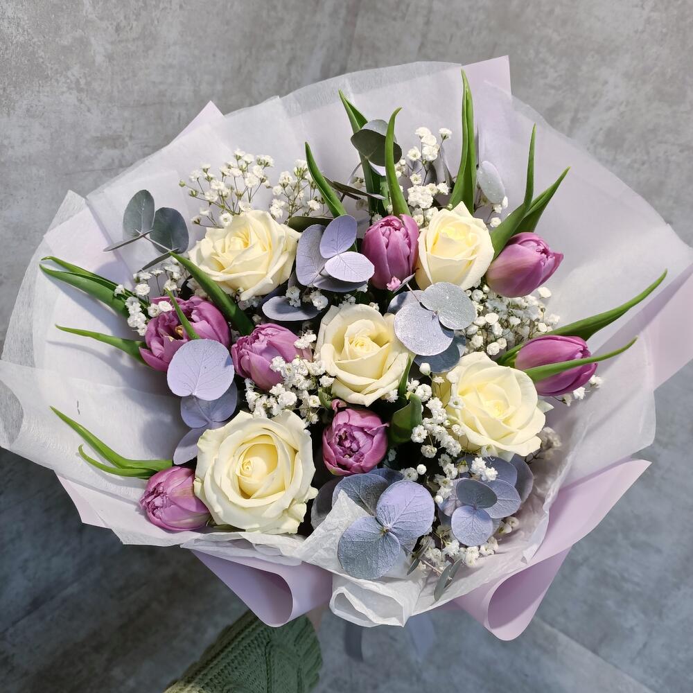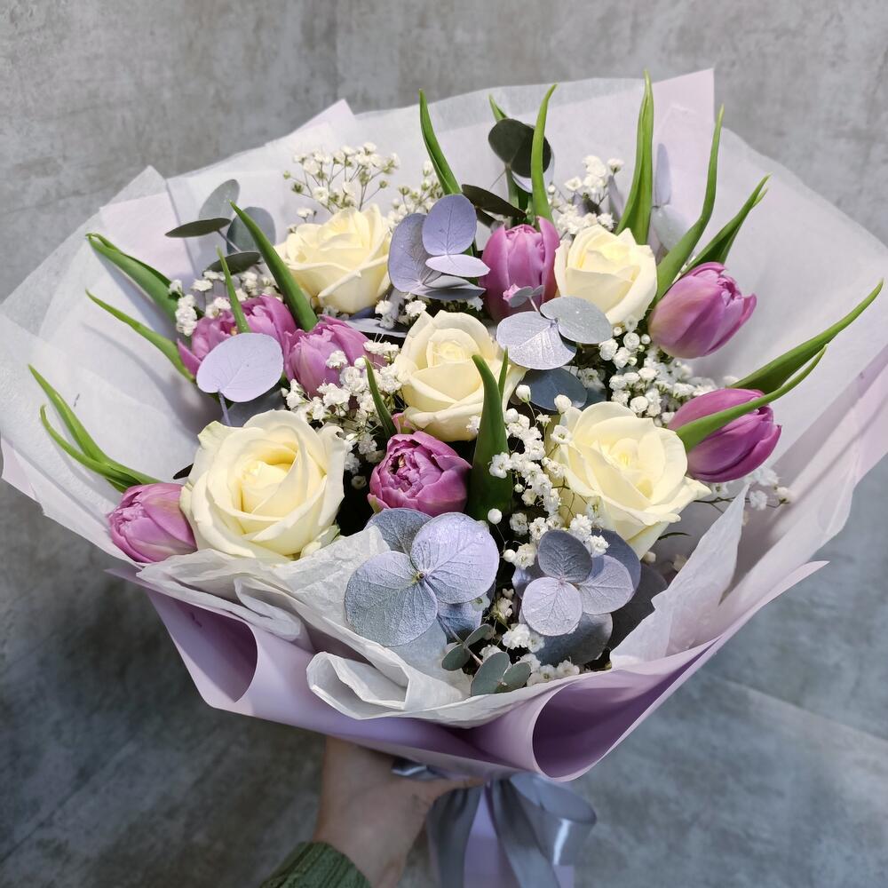 Гипсофила – 2 шт.Тюльпан – 7 шт.Эвкалипт – 3 шт.Роза – 5 шт.Упаковка дизайнерская – 1 шт.