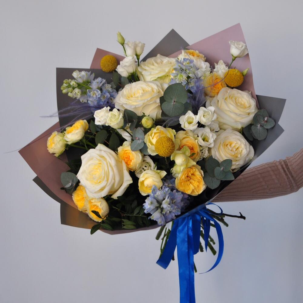 Дельфиниум – 3 шт.Краспедия – 3 шт.Эвкалипт – 2 шт.Эустома – 5 шт.Фисташка – 10 шт.Роза пионовидная – 5 шт.Роза кустовая пионовидная – 3 шт.Упаковка дизайнерская – 2 шт.