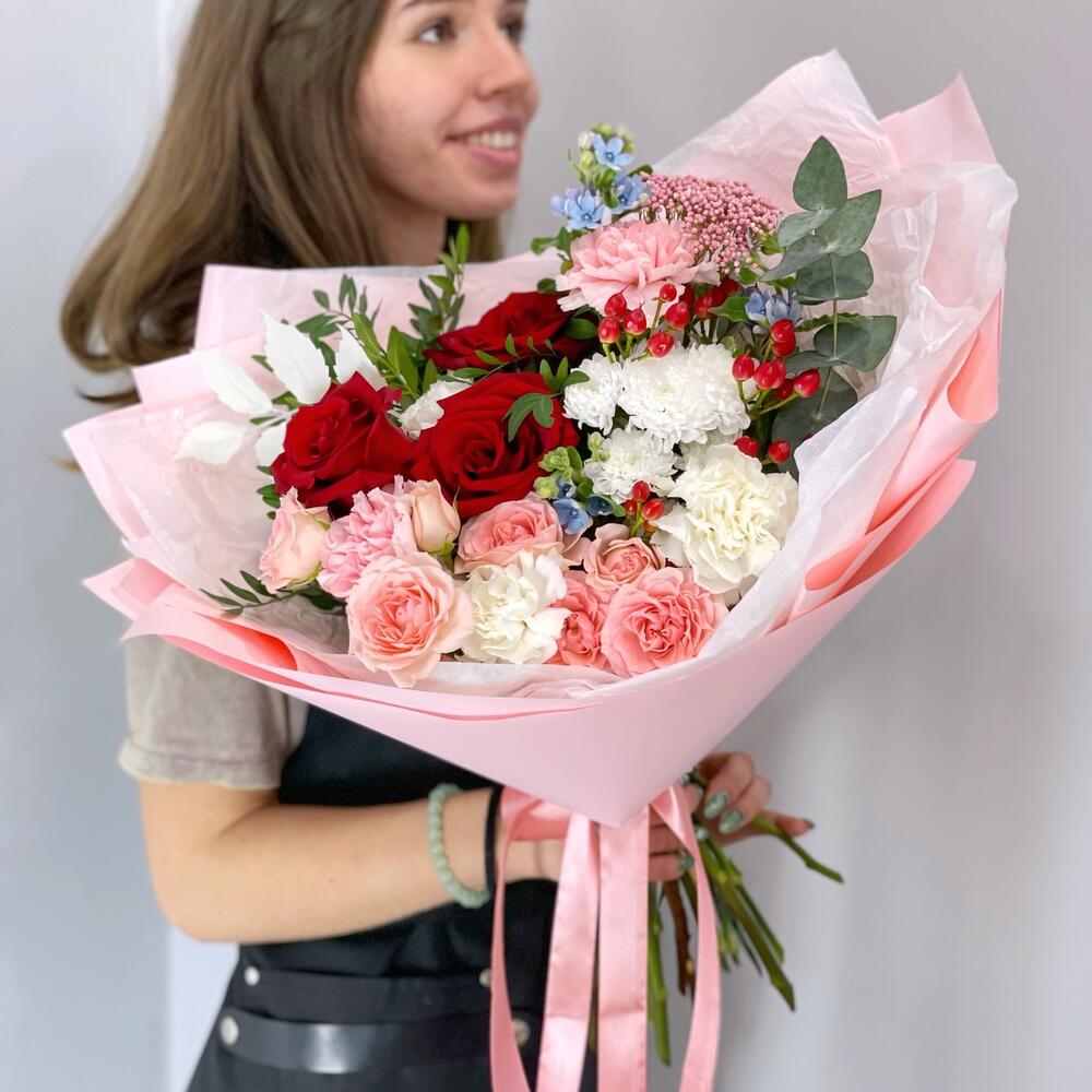 Озотамнус – 1 шт.Роза кустовая – 3 шт.Гвоздика – 5 шт.Фисташка – 2 шт.Хиперикум – 1 шт.Упаковка дизайнерская – 1 шт.Декор – 1 шт.твидия голубая – 3 шт.красные розы эквадор – 3 шт.