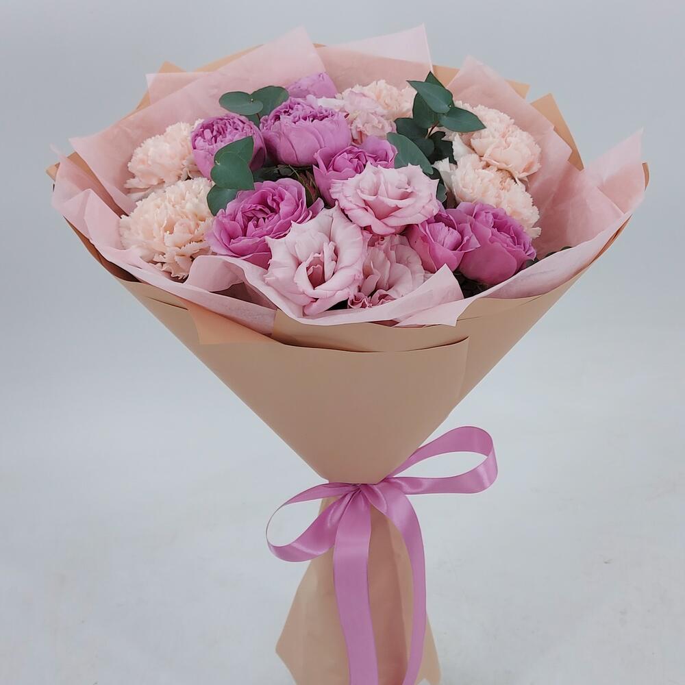 Букет с кустовыми пион. розами, эустомой и диантусами