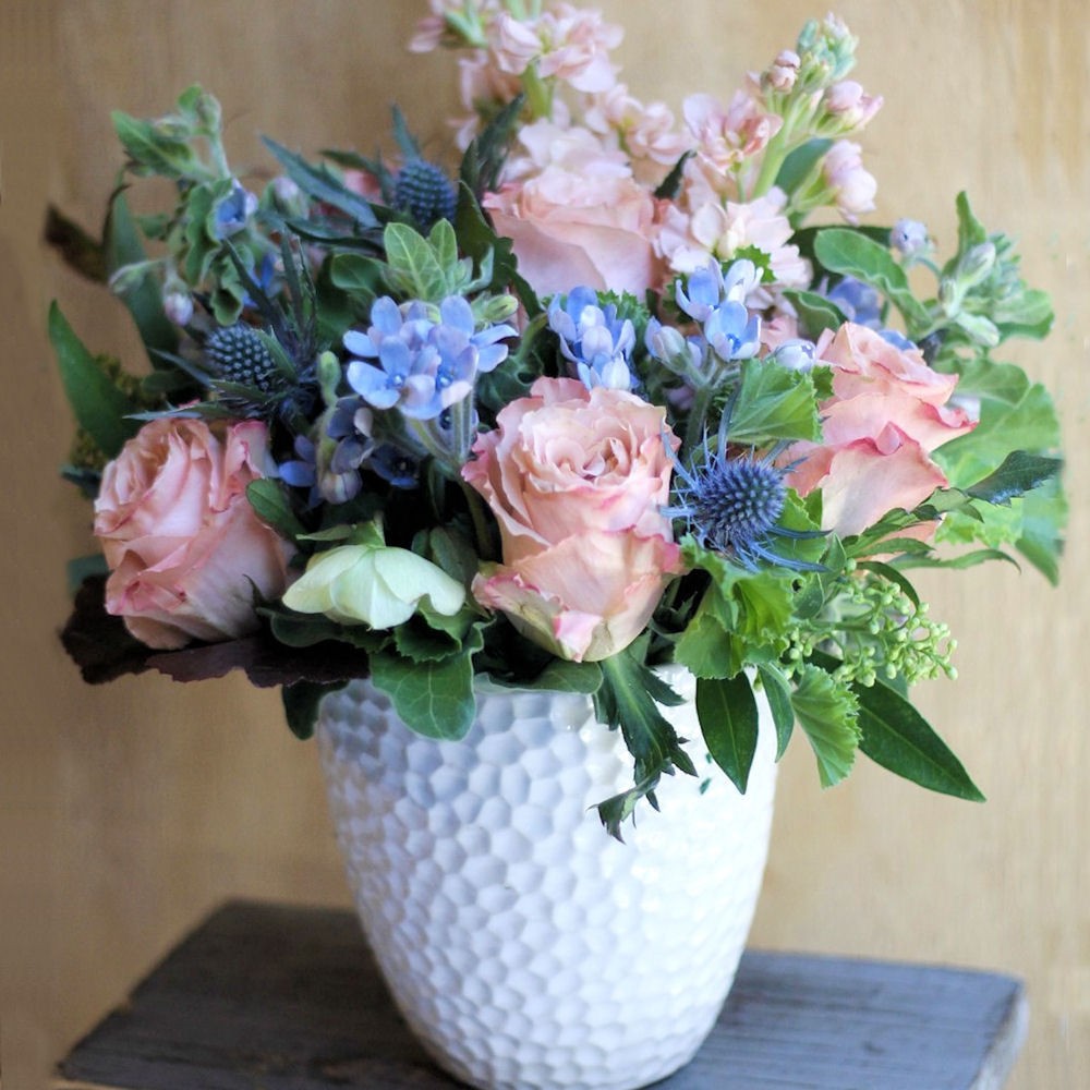Букет с маттиолой, эрингиумом и розой в кашпо “Живопись”