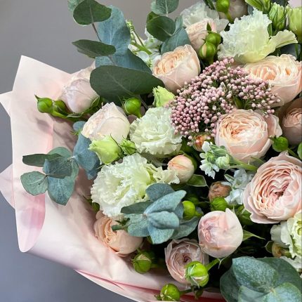 Пионовидная роза – 3 шт.Роза пионовидная кустовая – 2 шт.Гвоздика сортовая – 3 шт.Маттиола – 2 шт.Ваксфлауэр – 3 шт.Лизиантус – 1 шт.Упаковка дизайнерская – 1 шт.