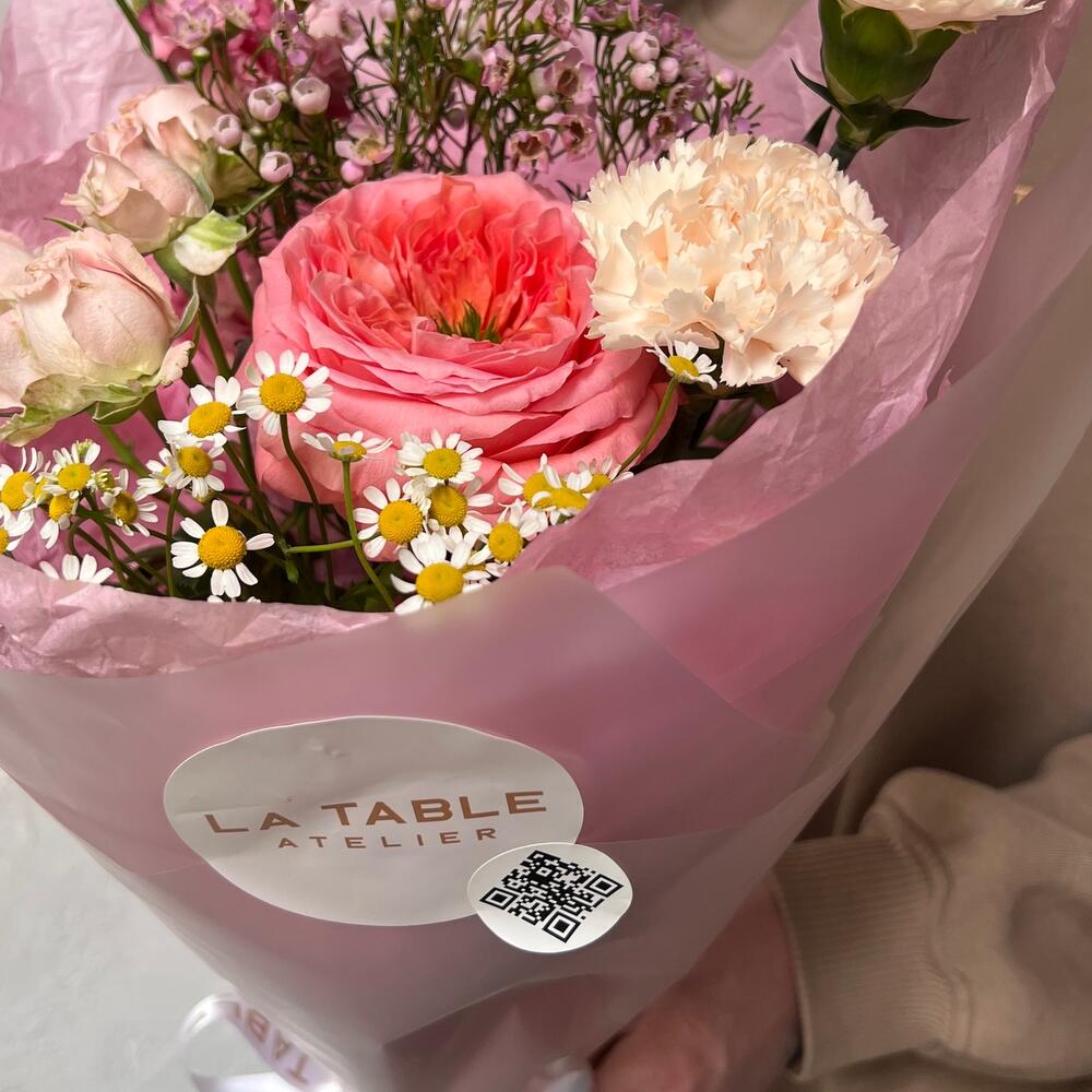 Роза пионовидная – 1 шт.Ваксфлауэр – 1 шт.Роза кустовая пионовидная – 1 шт.Гвоздика – 2 шт.Лизиантус – 1 шт.Матрикария – 1 шт.Упаковка дизайнерская – 1 шт.