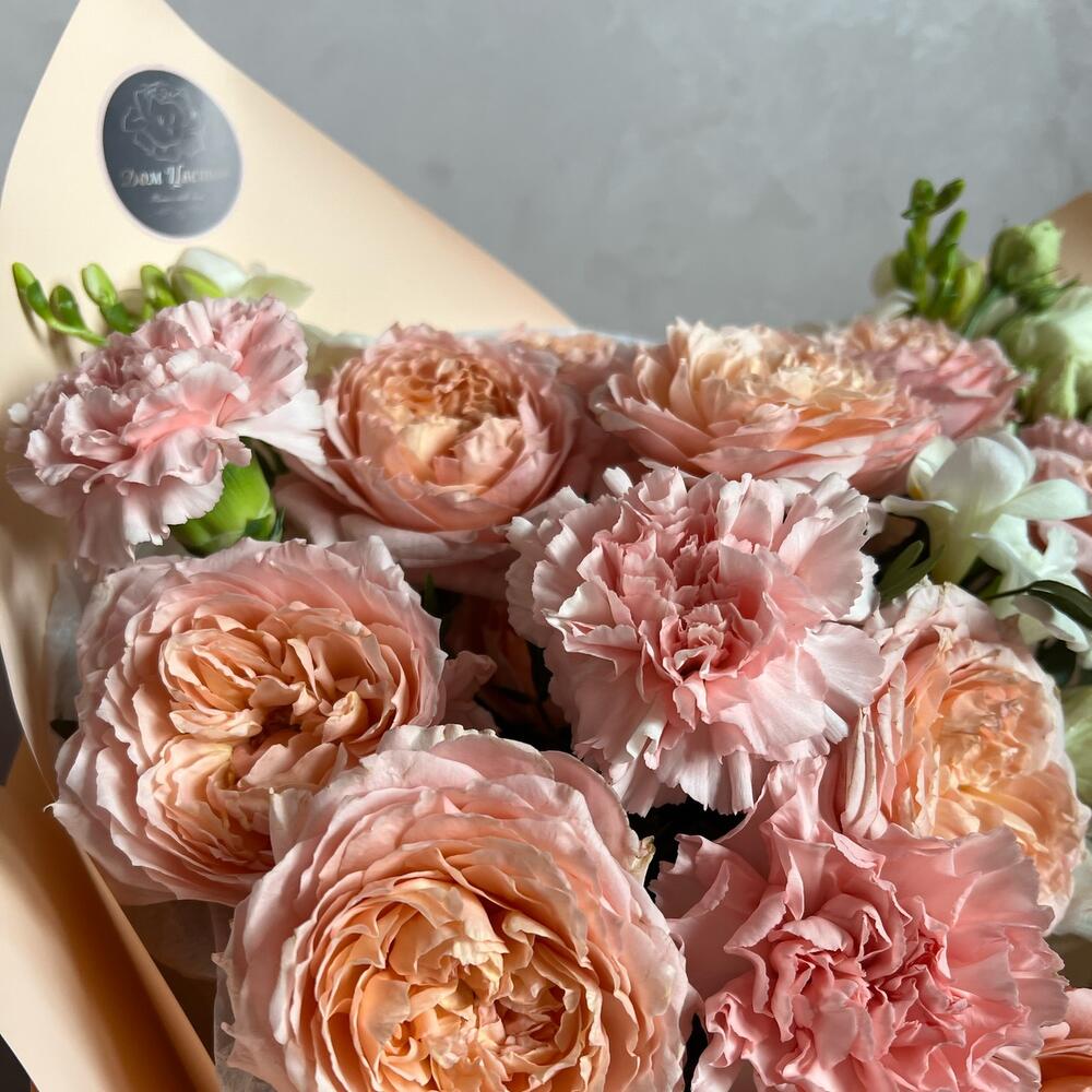 Пионовидная кустовая роза – 2 шт.Лизиантус (эустома) – 3 шт.Фрезия – 3 шт.Диантус – 5 шт.Фисташка – 3 шт.декоративная упаковка – 1 шт.Атласная лента – 1 шт.