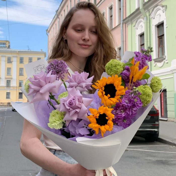 Роза – 3 шт.Гортензия – 1 шт.Подсолнух – 2 шт.Вибурнум – 1 шт.Гвоздика – 3 шт.Аллиум – 1 шт.Маттиола – 2 шт.Лагурус – 1 шт.Упаковка дизайнерская – 1 шт.