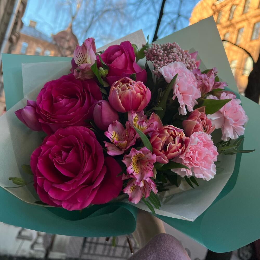 Букет с розами и пионовидными тюльпанами