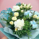 Гипсофила – 1 шт.Роза кустовая – 3 шт.Упаковка – 2 шт.Диантус – 3 шт.Фисташка – 3 шт.Хлопок натуральный – 3 шт.