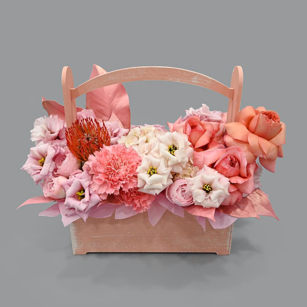 Гортензия – 1 шт.Пионовидная кустовая роза – 4 шт.Пионовидная роза – 3 шт.Эустома – 4 шт.Гвоздика – 3 шт.Нутан – 1 шт.Рускус – 5 шт.Магнолия – 2 шт.Ящик деревянный – 1 шт.