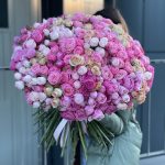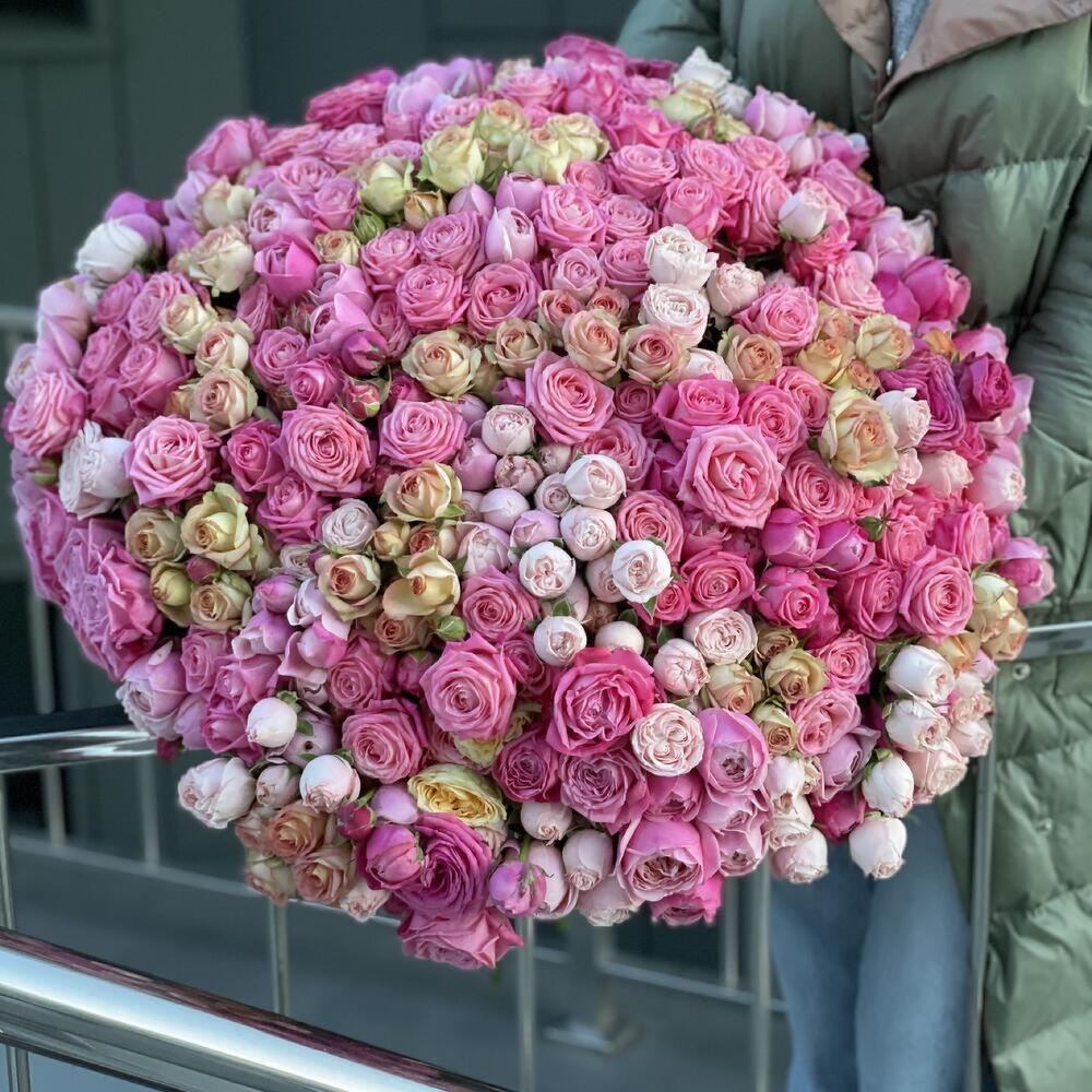 Кустовая роза пионовидная – 101 шт. Открыточка с вашими пожеланиями – 1 шт. Атласная лента – 1 шт.