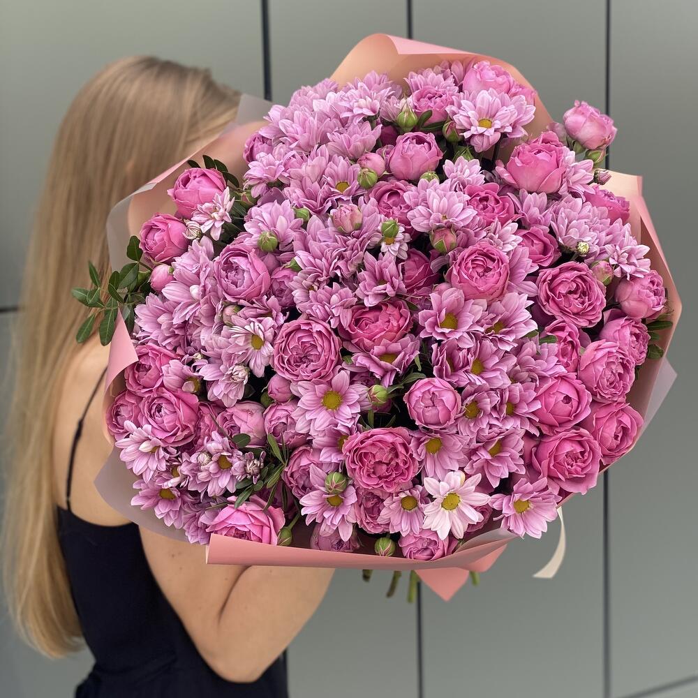 Хризантема гранд пинк – 14 шт. кустовая пионовидная роза misty bubbles – 10 шт. Писташ – 5 шт. Оформление – 1 шт.