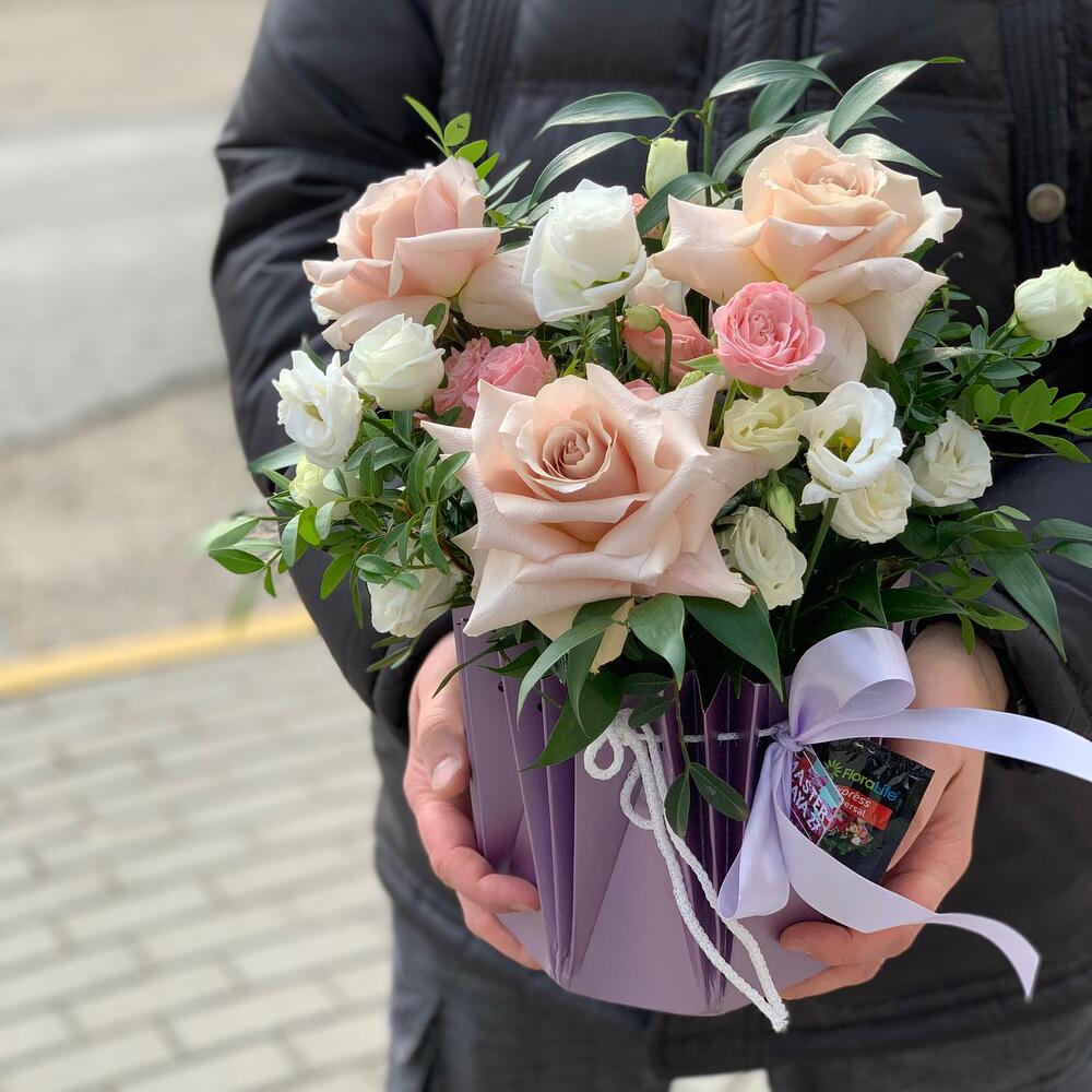 Роза – 3 шт. Эустома – 3 шт. Кустовая роза пионовидная – 3 шт. Писташ – 5 шт. Итальянский рускус – 1 шт.