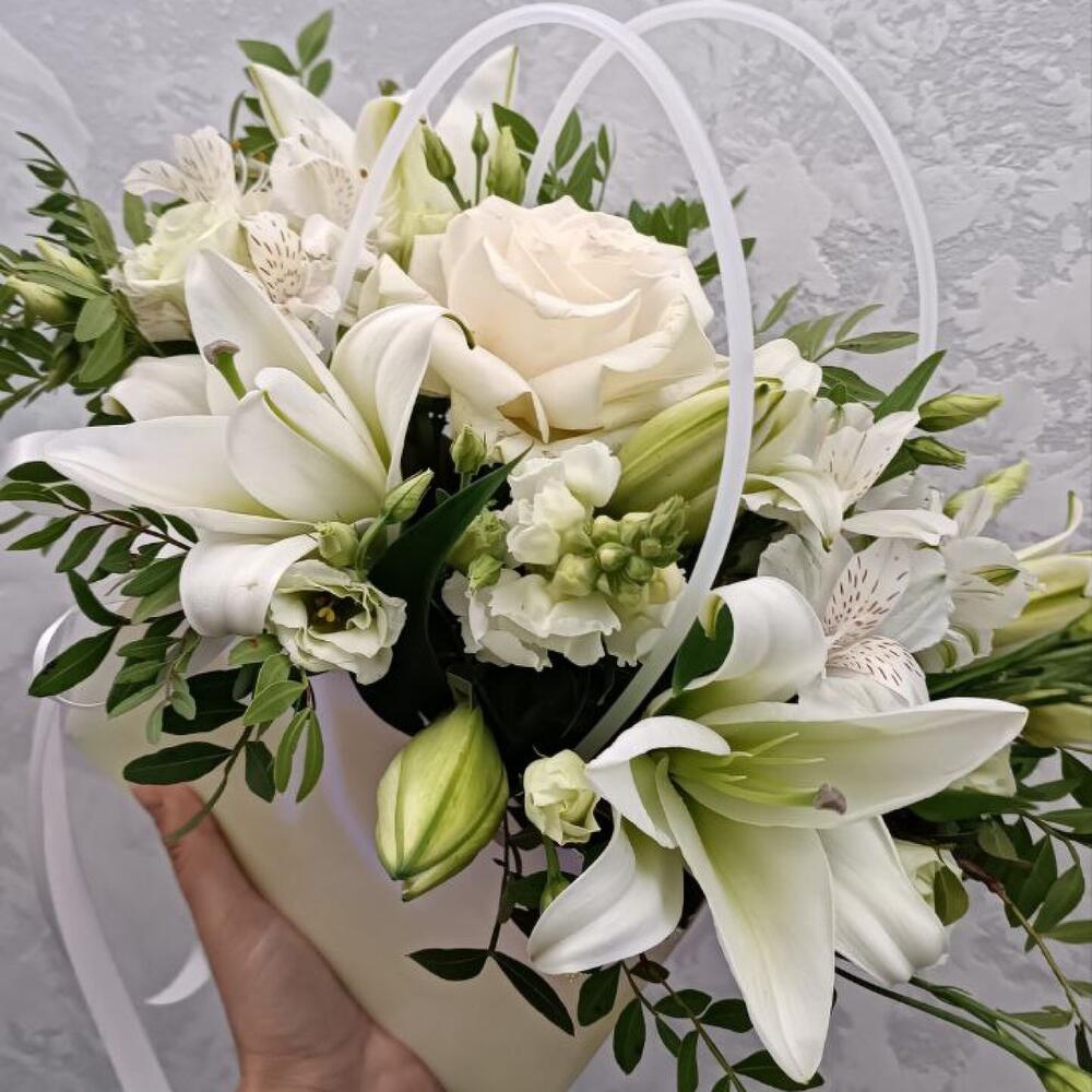 Альстромерия – 3 шт. Лилия – 1 шт. Писташ – 5 шт. Роза Эквадор – 1 шт. эустома белая – 3 шт. анирринум белый – 3 шт.